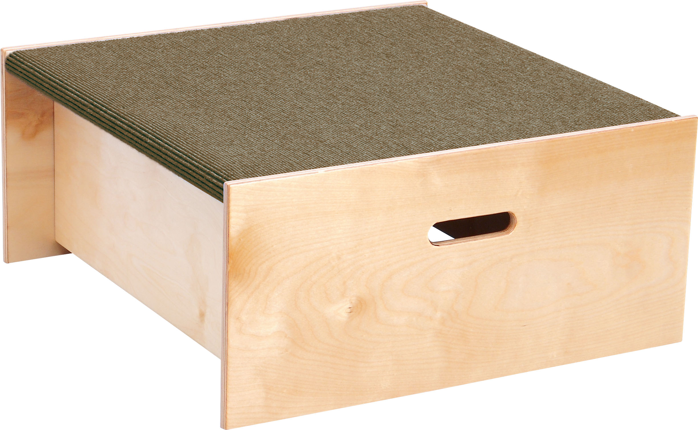 Kvadratinė platforma, pagaminta iš medžio ir padengta kilimu, įvairių spalvų.