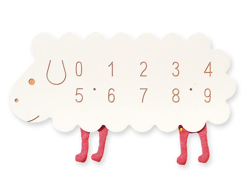 Sieninė aplikacija avys su skaičiais. Vaikas, vedžiodamas medinį smeigtuką išilgai skaičių griovelių, ruošia ranką mokytis rašyti ir lavina vizualinį-motorinį suvokimą. Aplikacija pagaminta iš MDF, o avies kojos pagamintos iš audinio ir užpildytos rutuliukais. Prie lentos pritvirtintas medinis pagaliukas rašymui.