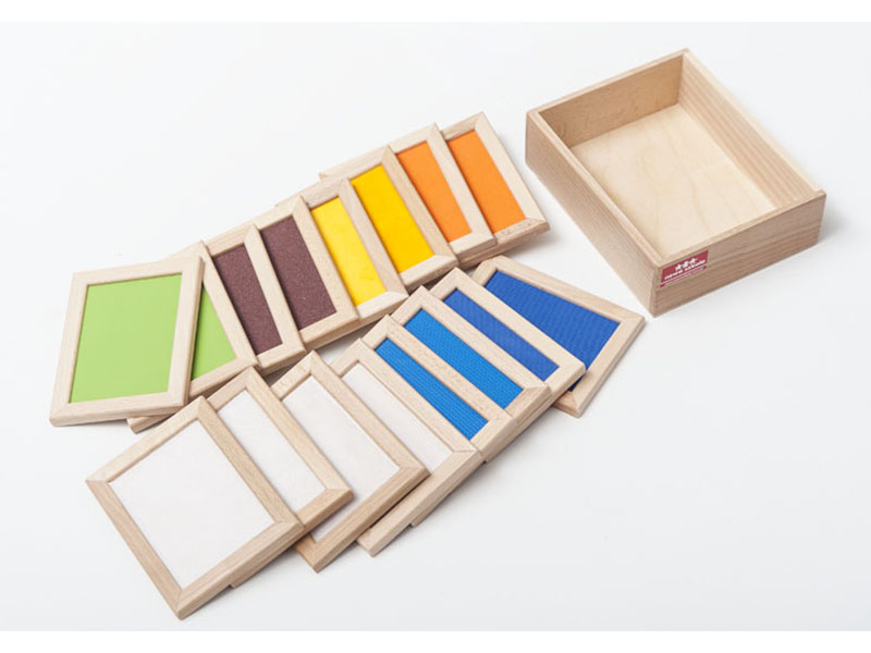 8 porų skirtingų medžiagų tekstūrų lentelių rinkinys. Dėl lentelės dydžio į ją galima įdėti visą mažo vaiko ranką. Žaidžiant su plokštelėmis stimuliuojami rankų receptoriai. Viskas patalpinta į medinį pagrindą.