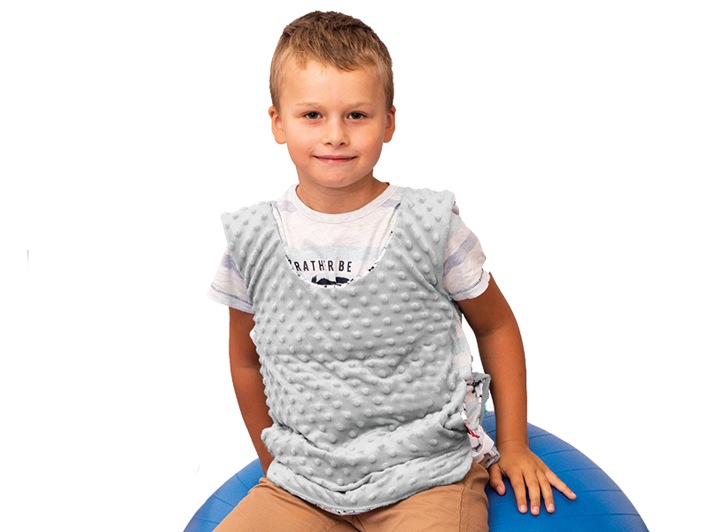 Liemenė pasiūta iš minkšto, jutiminio "Minky" audinio su apvaliais įspaudais ir margintomis medvilninio trikotažo detalėmis. Kad būtų patogu naudoti, yra 2 poros plastikinių užsegamų sagčių, kad būtų galima greitai užsidėti ir nusiimti. Liemenė skirta sensorinės integracijos sutrikimų turinčių žmonių terapijai ir reabilitacijai. Naudojant ji švelniai spaudžia kūną ir stimuliuoja vestibulo-propriocepcinę sistemą, atsakingą už giliuosius pojūčius. Proprioceptoriai, esantys raumenyse ir sausgyslėse, praneša mums, kaip mūsų kūnas ar jo dalys yra išsidėstę. Stimuliuojant proprioceptorius atsipalaiduojama, nurimstama ir padidėja kūno suvokimas, pagerėja dėmesio koncentracija ir susikaupimas, sumažėja savęs stimuliavimas ir padedama sumažinti baimės, nerimo ir nesaugumo jausmą.