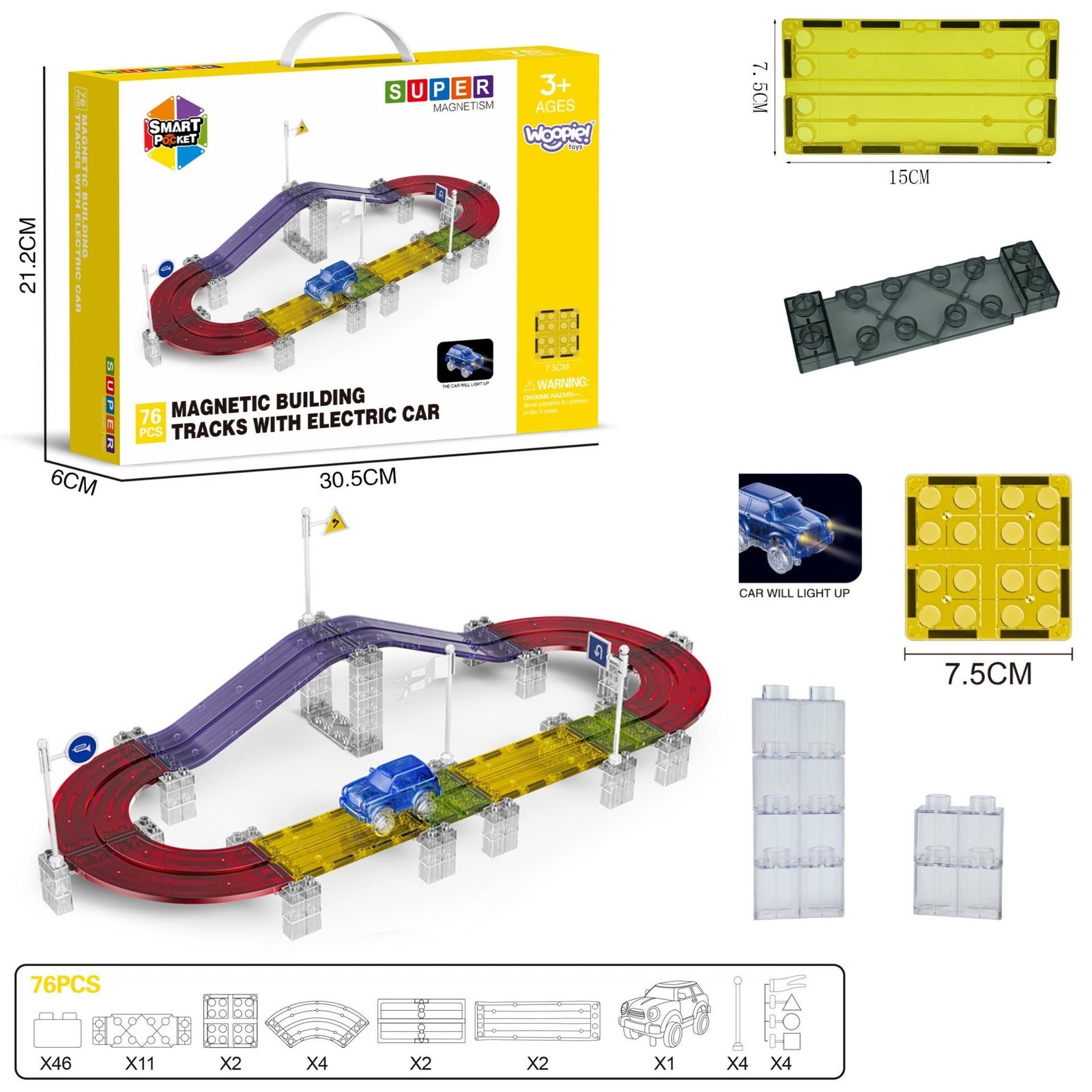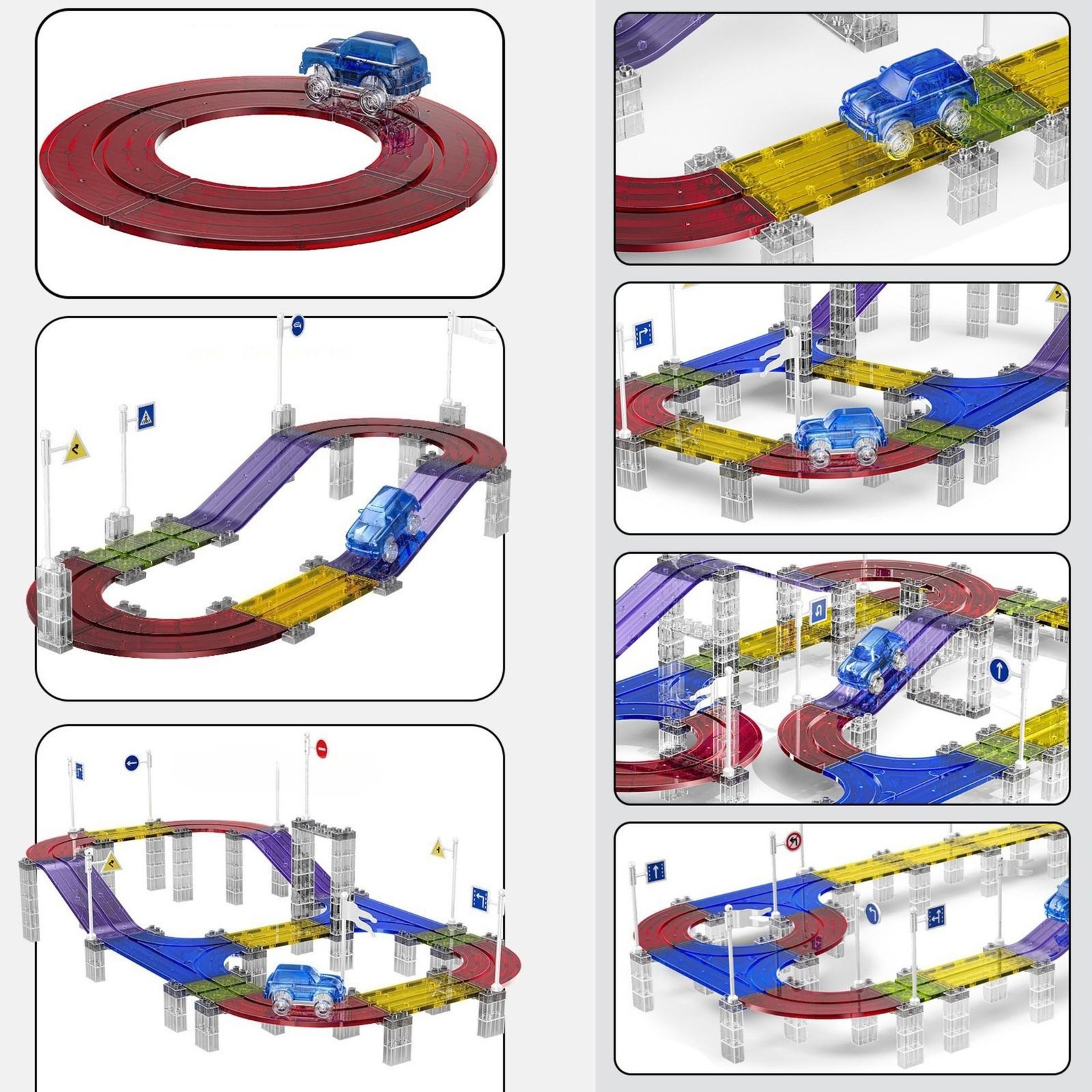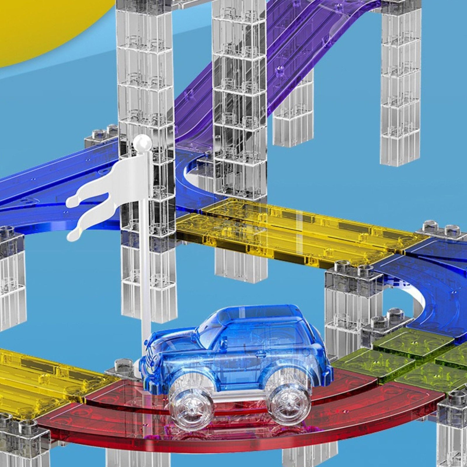 Magnetinė Lenktynių Trasa – kūrybiškas žaislas vaikams nuo 3 metų su LED apšviestu automobiliu, spalvingais ir skaidriais bėgių elementais bei lengvai sujungiamais magnetiniais moduliais. Vaikai gali kurti daugiapakopes trasas su tiltų, rampų ir posūkių elementais.