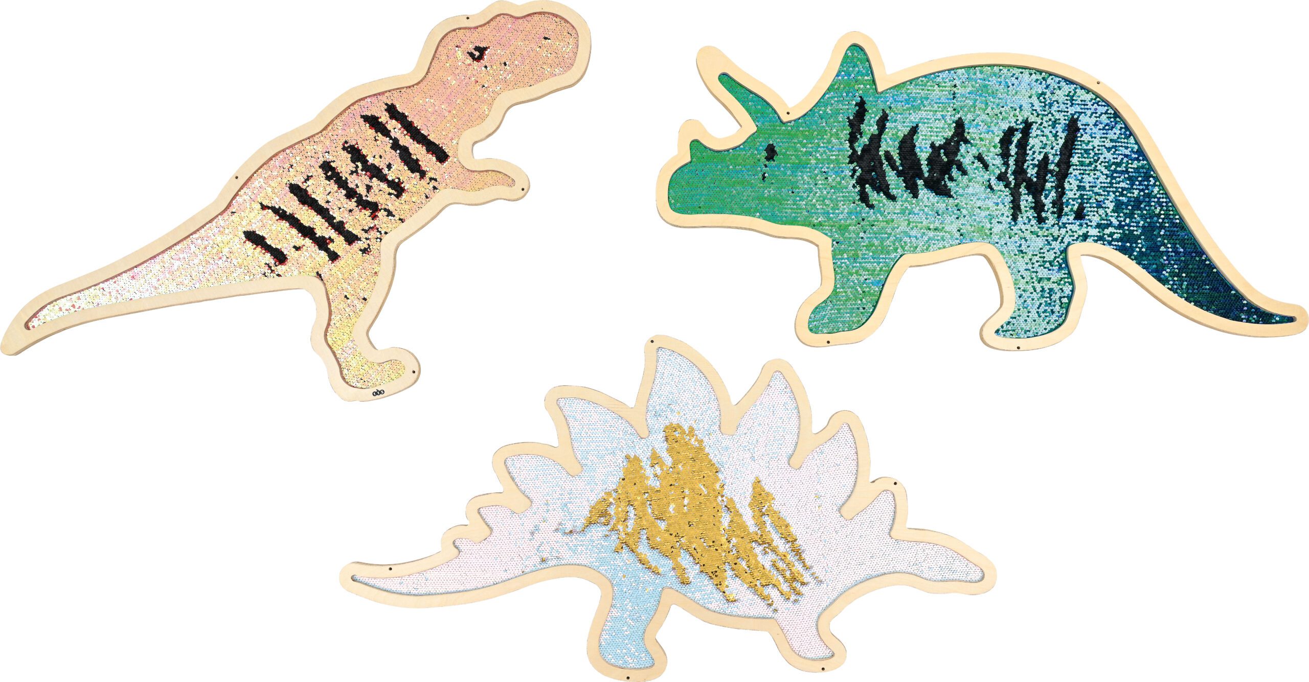 Blizgančiais žvyneliais dekoruoti dinozaurai su mediniais rėmais skirti sensorinei terapijai ir darželiams. Jie lavina lytėjimą, regą, smulkiąją motoriką ir kūrybišką saviraišką. Gali būti tvirtinami prie sienos.