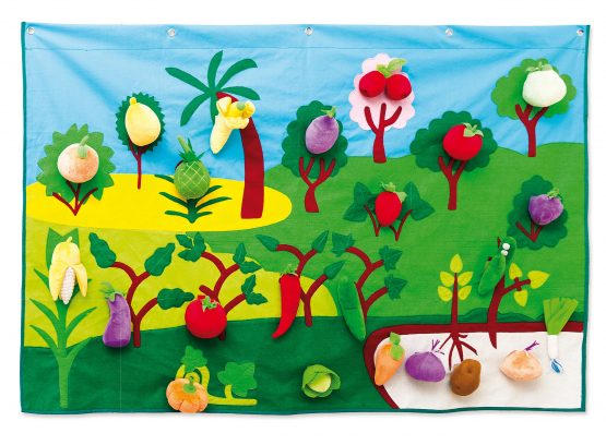 Ryškių spalvų sienų dekoracija 100×150 cm, 10 skirtingų vaisių ir 11 daržovių.