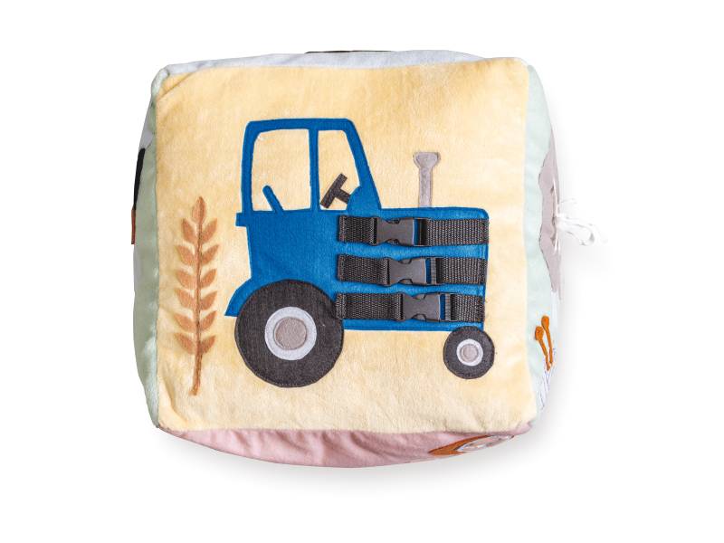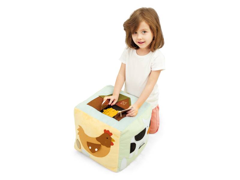 Kubo šonuose esančios virvelės, sagos, sagtys ir užtrauktukas leidžia lavinti pirštų miklumą ir lavinti pagrindinius apsirengimo įgūdžius (rišimas ir užsegimas).