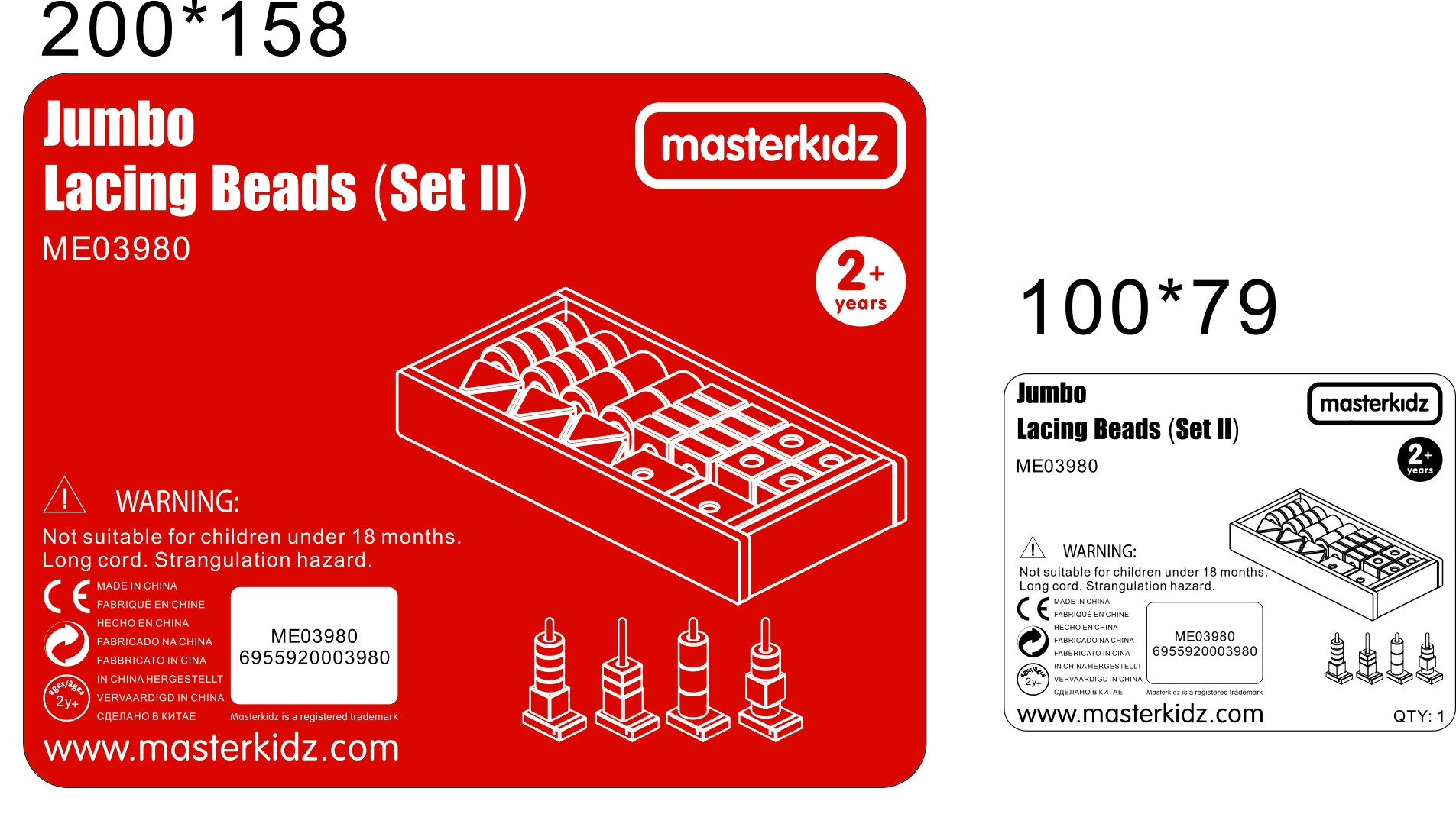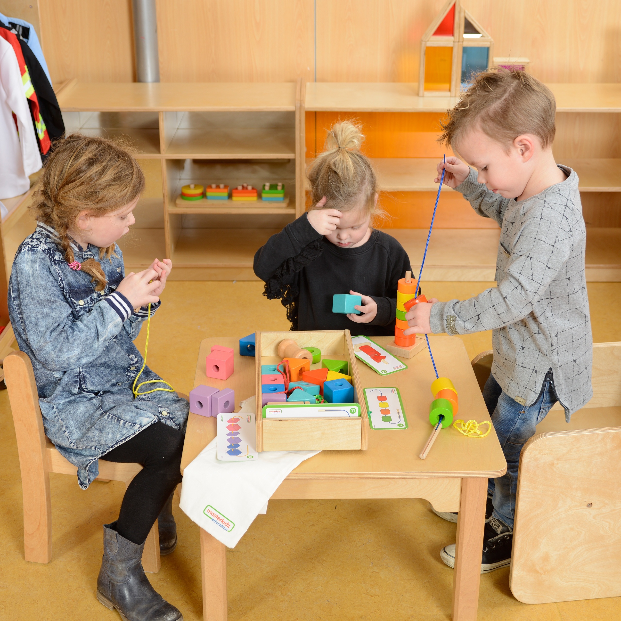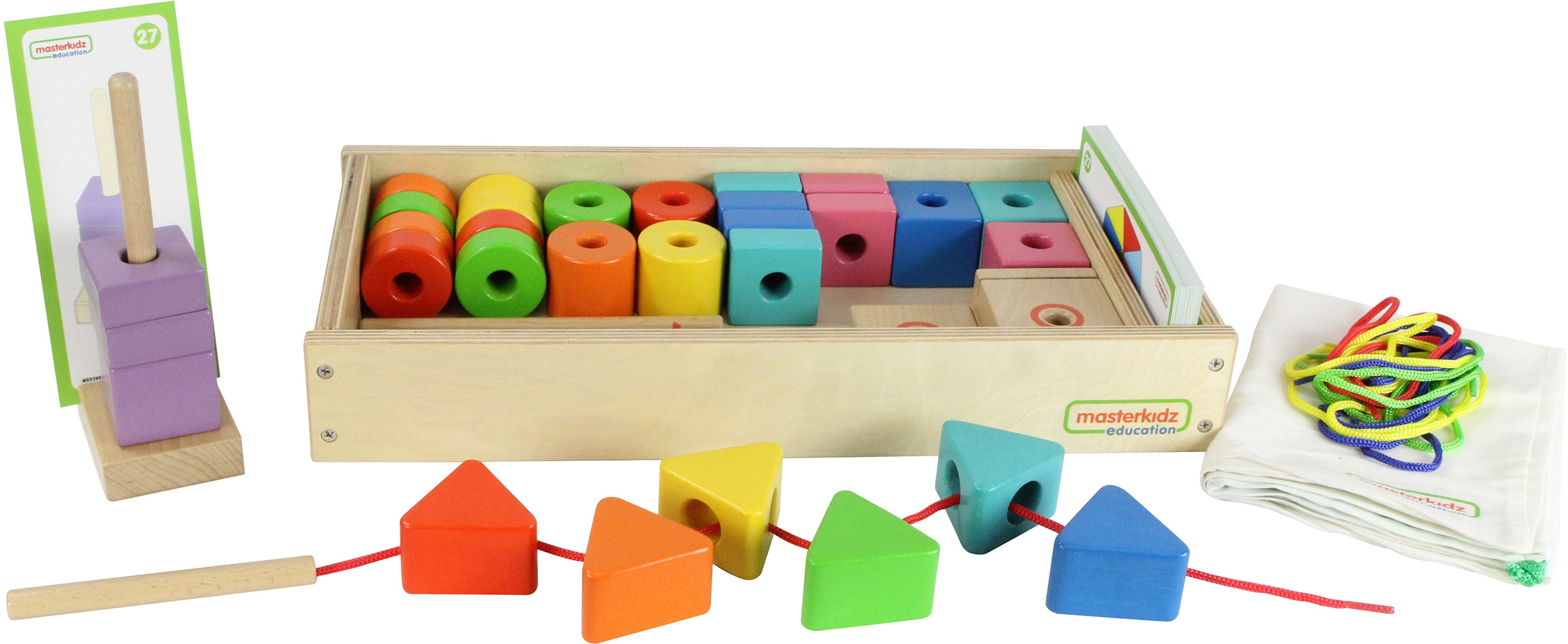 A wonderful set of colorful beads in various colors and shapes that can be used for sorting, counting, or stringing. Children can play independently or use the task cards that suggest patterns and diagrams. The set also includes three stands to aid stringing.