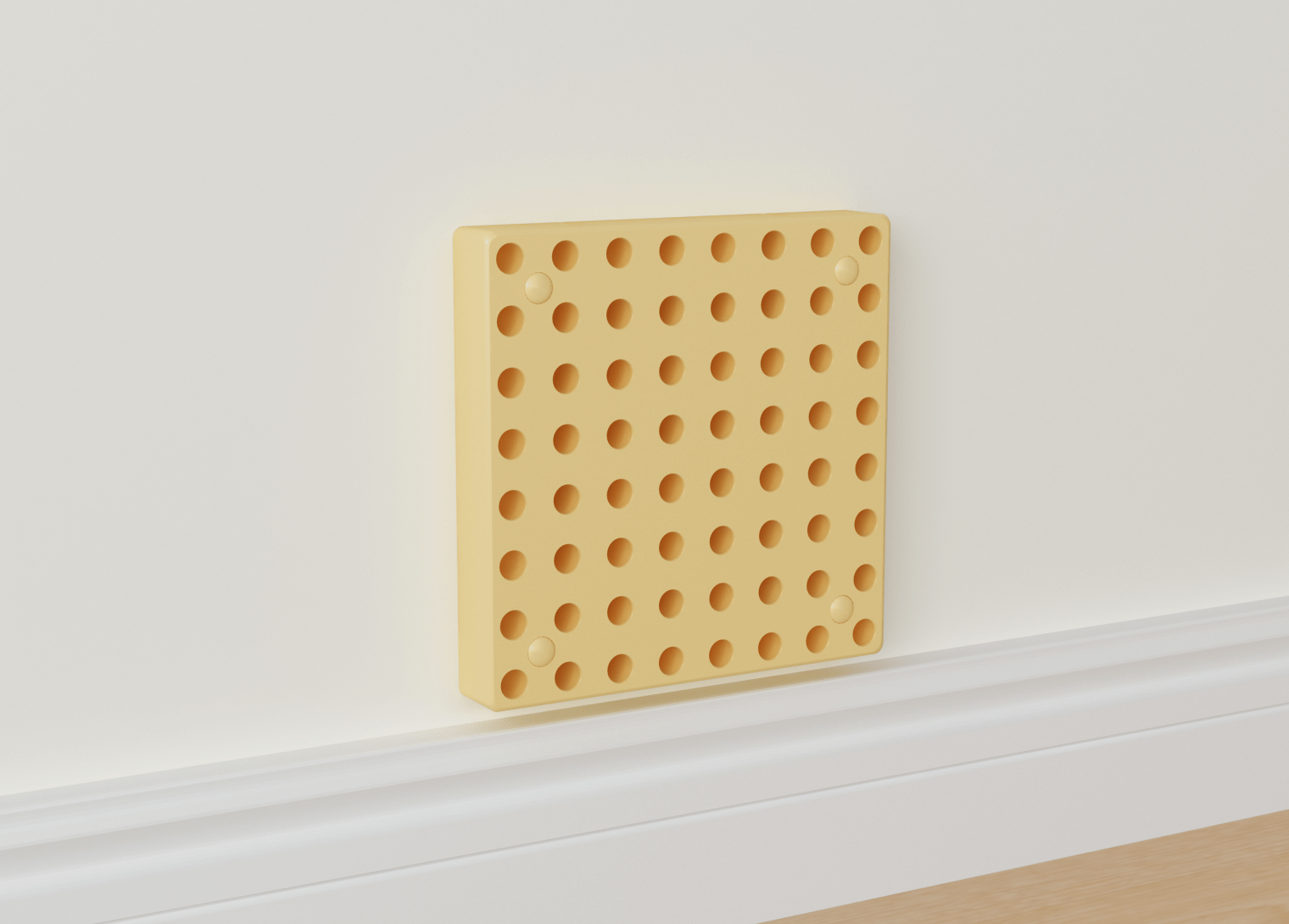 Plati 20×20 cm panelė turi skylutes, į kurias galima įstatyti spalvingus smeigtukus, kad sukurtumėte raštus. Taip pat prie lentos galima pritvirtinti įvairias edukacines priemones, krumpliaračius, vamzdžių sistemas ir kitus įdomius elementus.