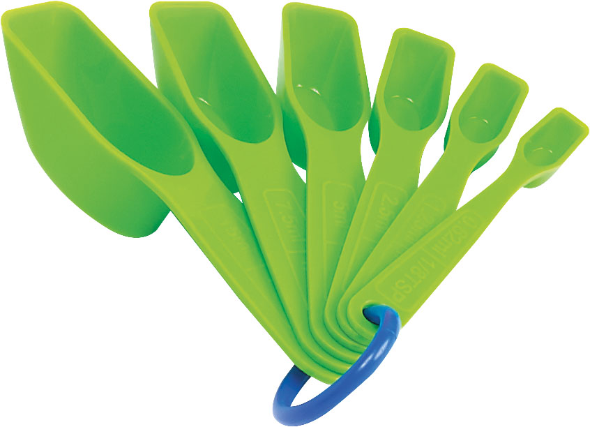 6 tarpusavyje sujungti skirtingos talpos šaukštai, pagaminti iš plastiko.