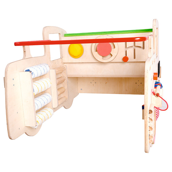 • kilnojamasis vairas su pavarų dėže ir vamzdžiu • stumdomi elementai • skirtingos struktūros medžiagos • minkšti voleliai, • besisukantys mediniai volai su skirtingomis tekstūromis • metalinis vamzdis su stumdomais mediniais elementais • suoliukas