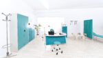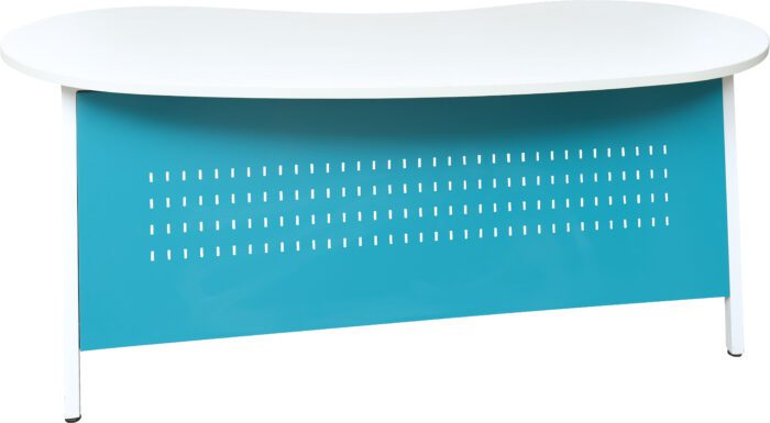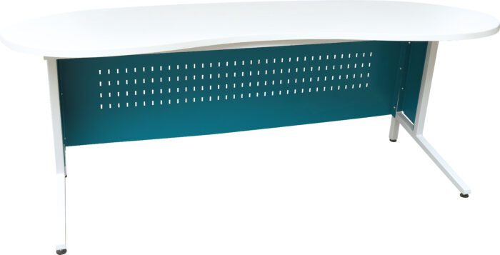Medicininis stalas su apvalintu stalviršiu, pagamintu iš laminuotos plokštės (25 mm storio) ir rėmu iš plieninių profilių. Kojos turi reguliuojamas pėdas.