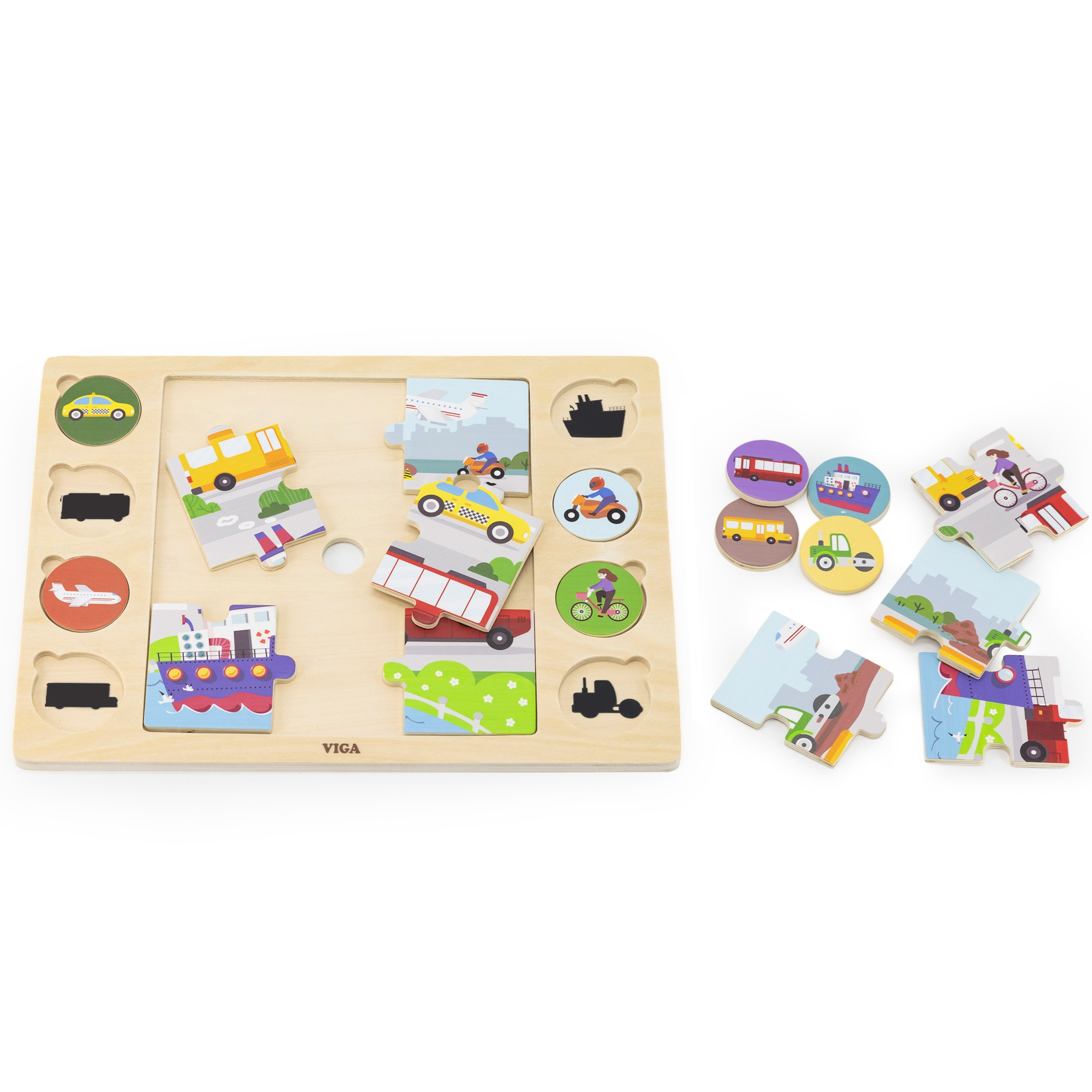 – 9 didelės dėlionės dalys, dėlionės lentelė, 8 mažesnės derinančios dėlionės dalys