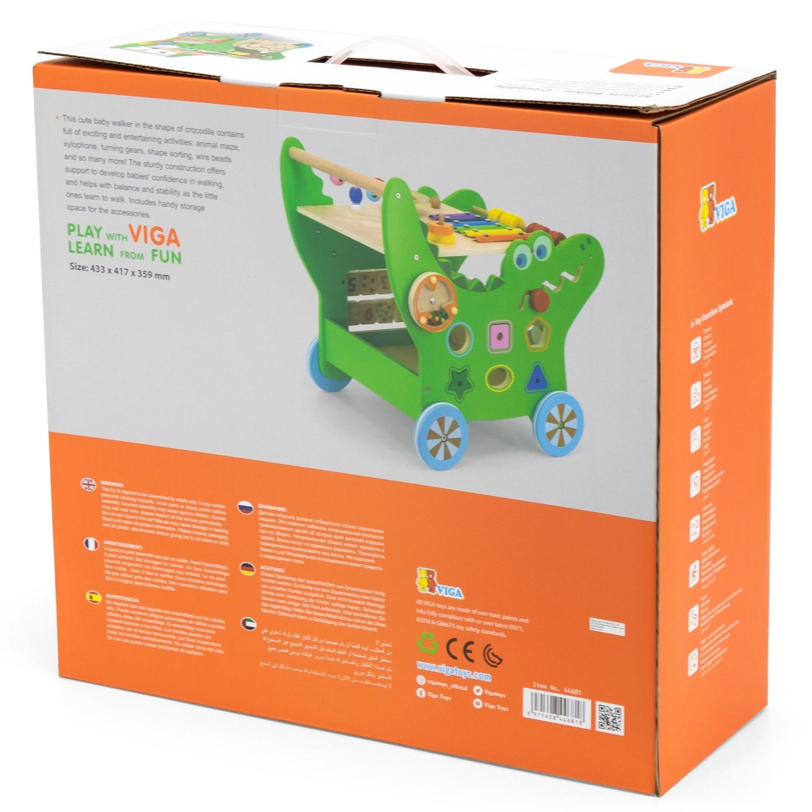 Medinė vaikštynė su įvairiomis veiklomis – labirintas, ksilofonas, pavaros, formų rūšiuotojas, abakus ir kt. Tvirta konstrukcija padeda vaikui saugiai žengti pirmuosius žingsnius ir palaiko pusiausvyrą. Žaislas skatina smulkiąją ir stambiąją motoriką, rankų-akių koordinaciją, loginį mąstymą, vaizduotę bei spalvų, formų ir skaičių pažinimą.
