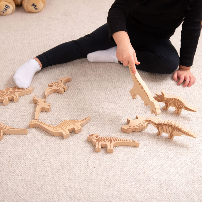 Medinės kaladėlės su išgraviruotomis taktilinėmis dinozaurų savybėmis vienoje pusėje ir jų skeletu – kitoje. Puiki priemonė pažinti priešistorinius laikus, skatina vaizduotę, kalbos vystymąsi ir kūrybišką žaidimą.