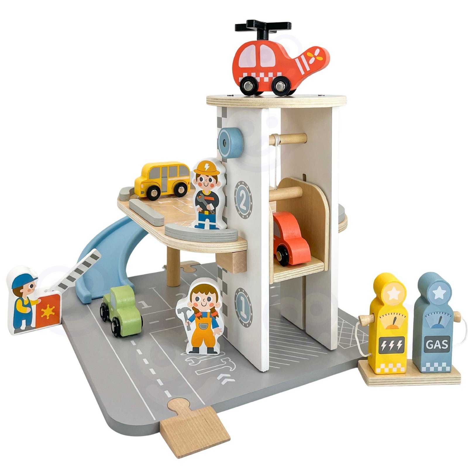 Rinkinys: garažas, degalų paskirstytojas, mėlynas spiralinis nusileidimas, 3 mediniai automobiliai, sraigtasparnis su besisukančiu sraigtu, 3 darbuotojų figūrėlės, 2 mažos rampas.