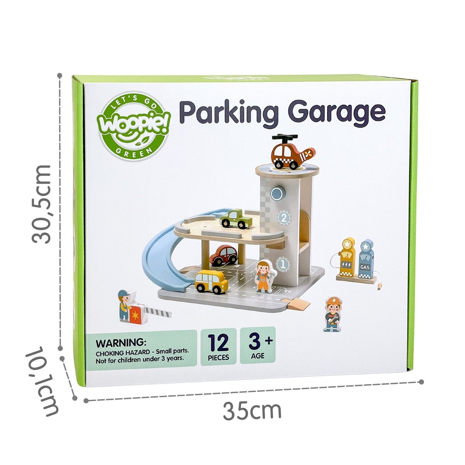Dviejų aukštų automobilių stovėjimo aikštelė su spiraliniu nusileidimu, sraigtasparnio nusileidimo aikštele, degalų paskirstytuvu, spalvingais mediniais automobiliais ir darbuotojų figūrėlėmis. Skirta vaikams nuo 3 metų, pagaminta iš aukštos kokybės medienos, su tvirtu pagrindu saugiam žaidimui.