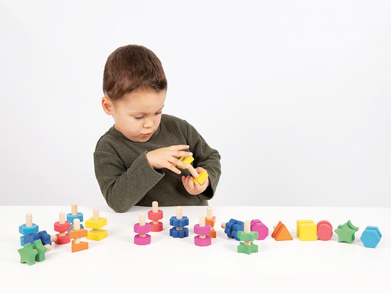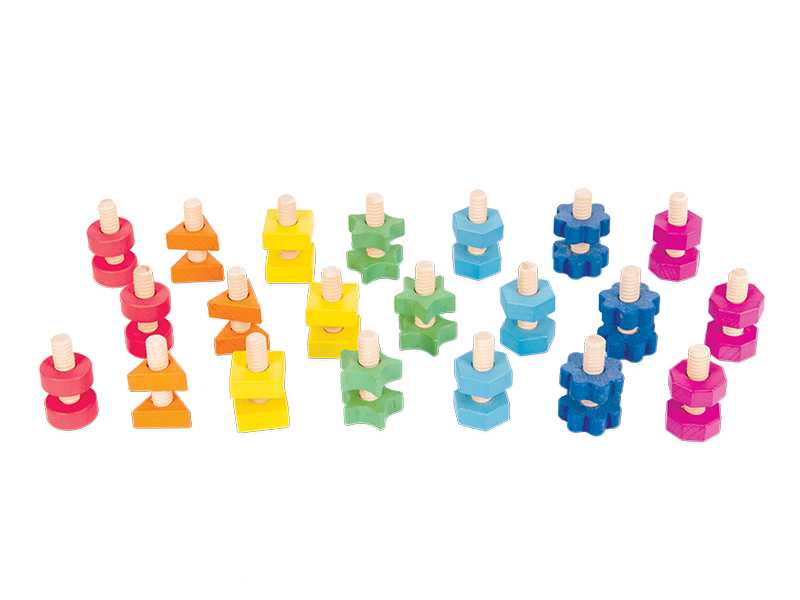 Įvairių formų ir spalvų tvirtos veržlės ir varžtai iš buko medienos. Kiekviena veržlė turi atitinkamą varžtą. Visos figūros turi skirtingą briaunų skaičių – nuo 1 iki 8. Atskirų detalių matmenys tinkami mažiems vaikams. Rinkinys puikiai tinka spalvų ir formų atpažinimo, ankstyvojo skaičiavimo mokymui, taip pat rankų miklumui, vikrumui ir rankų bei pirštų miklumui lavinti. Visas rinkinys įdėtas į medvilninį maišelį.