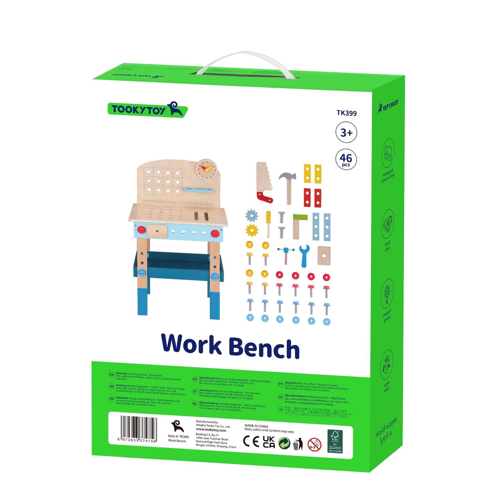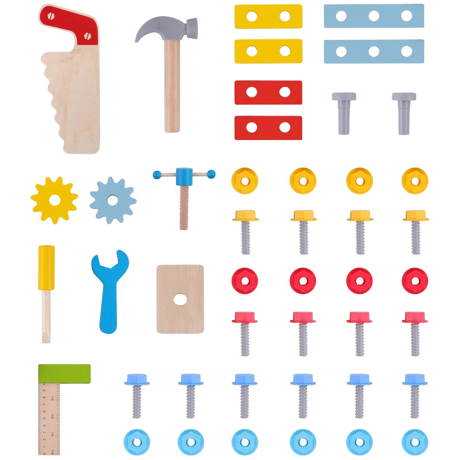 Rinkinį sudaro: stalas, žaisliniai įrankiai (pjūklas, plaktukas, raktas, atsuktuvas, matavimo juosta), staklės, žaislinis laikrodis, varžtai, veržlės, pavaros, lentos.
