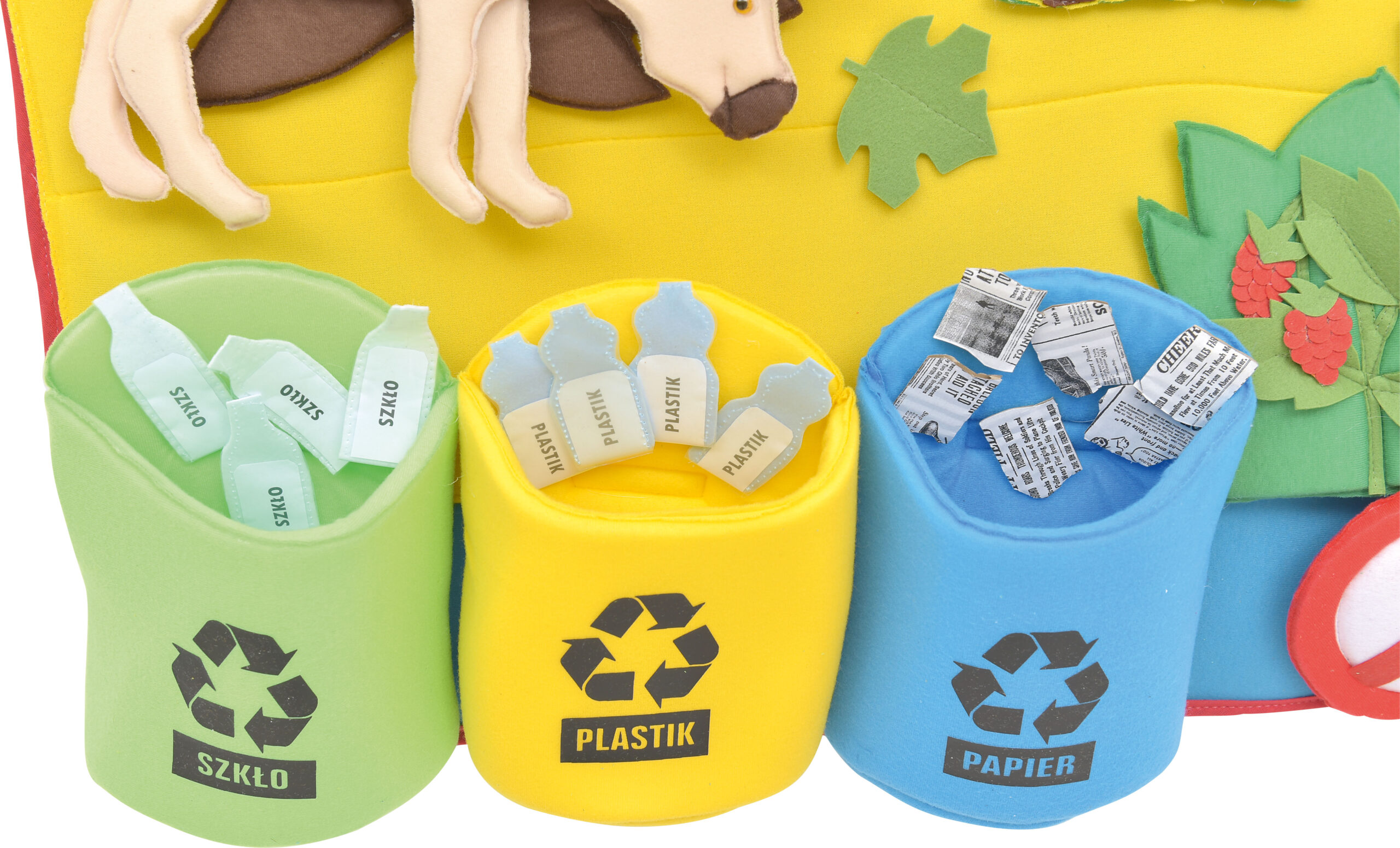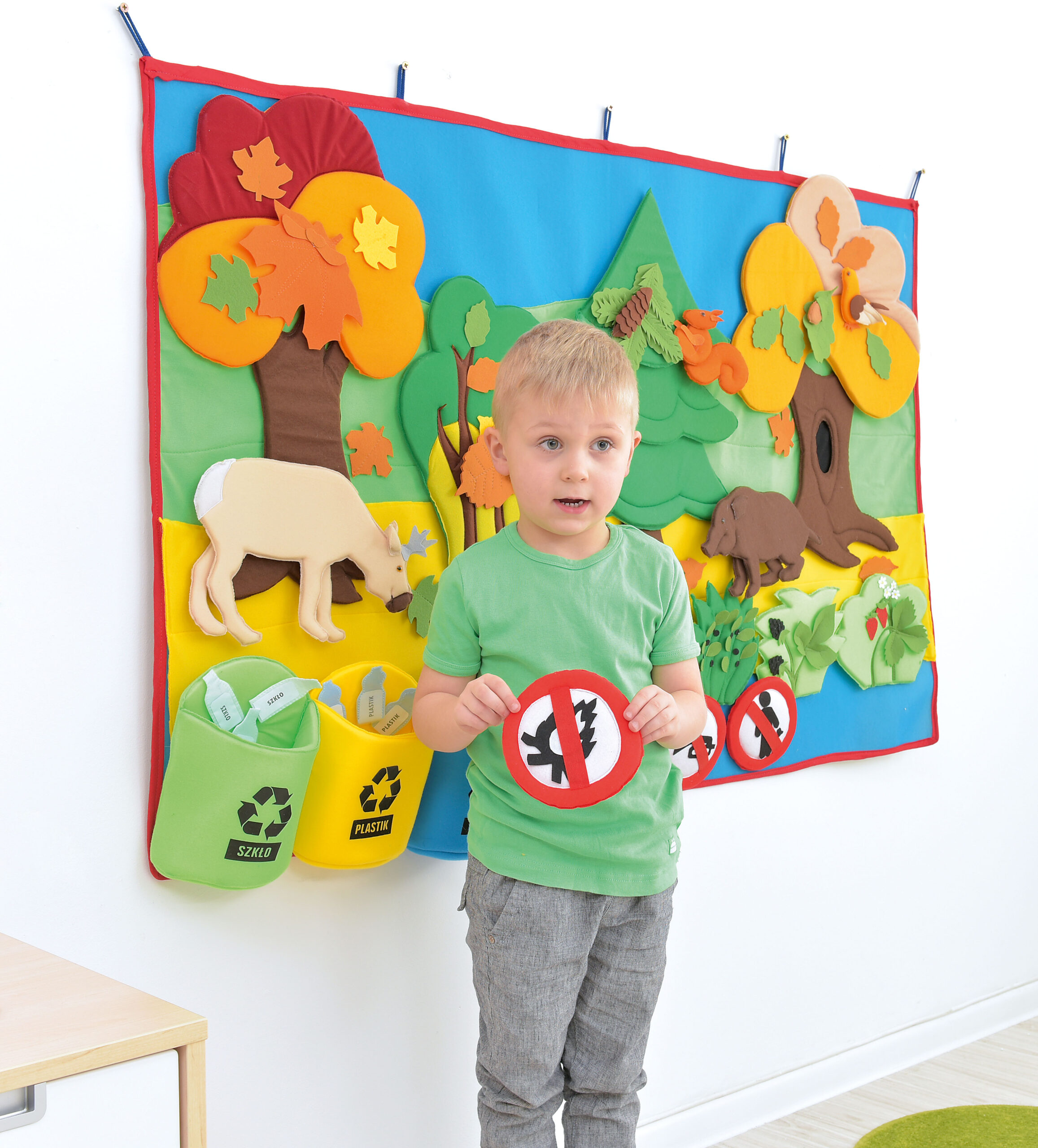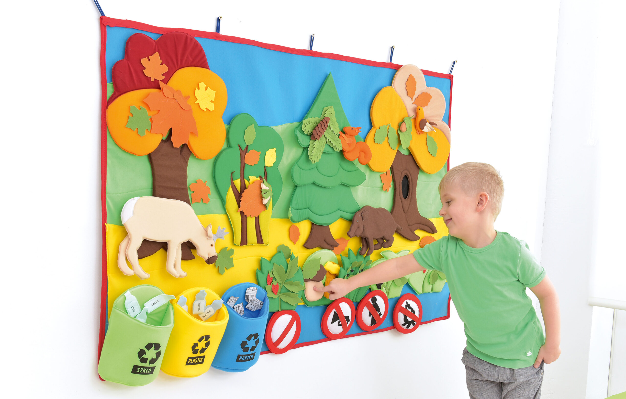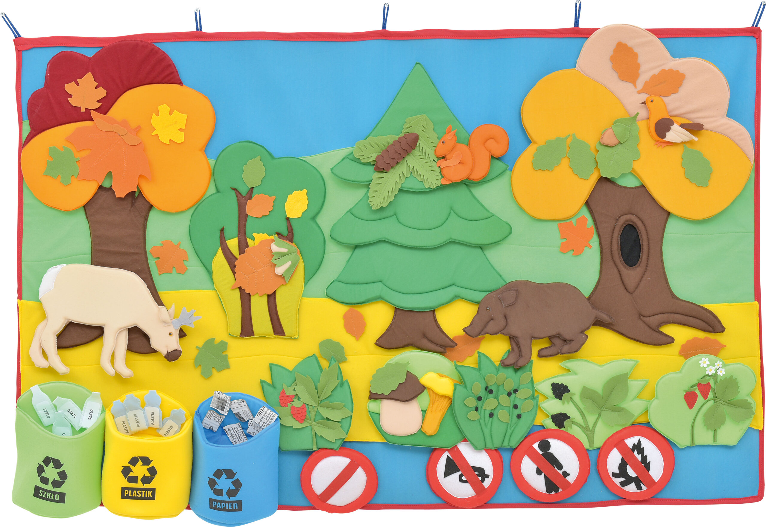 – 40 judančių elementų (lapai, gyvūnai, vaiskrūmiai, ženklai, šiukšlės, šiukšliadėžės) su „Velcro” užsegimais, kad juos būtų galima pritvirtinti bet kurioje paveikslėlio vietoje – veliūru išklota kempinė – matmenys 88 x 137 cm