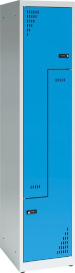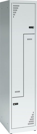 Plieninė, suvirinta 2 skyrių spintelė su kodine spyna. Durelės turi vėdinimo angas ir vietą identifikatoriui, o kiekvienoje sekcijoje yra drabužių strypas su dviem kabliukais – vienas plastikinis, kabinamas ant strypo, kitas metalinis, pritvirtintas prie šono. Spinta gali būti sujungta su kitomis spintomis arba pritvirtinta prie sienos stabilumui didinti.