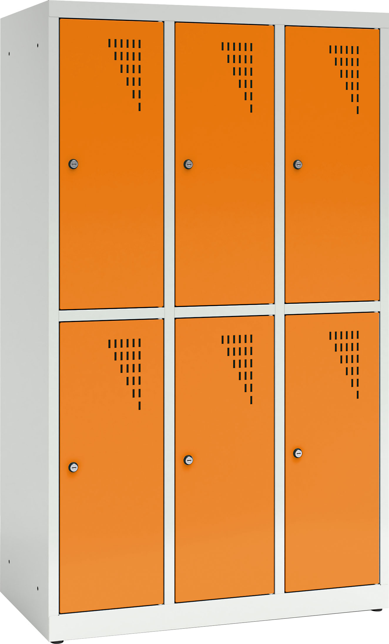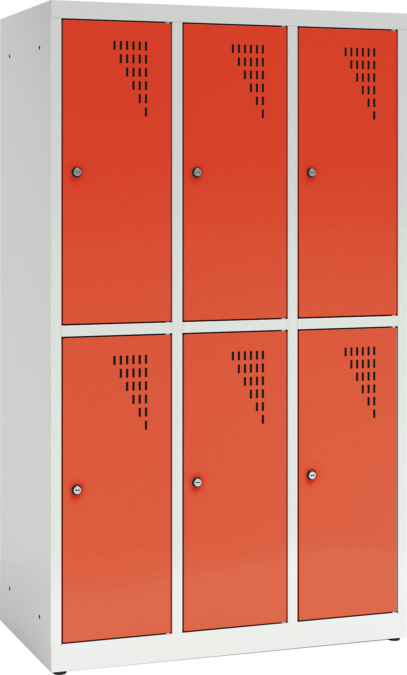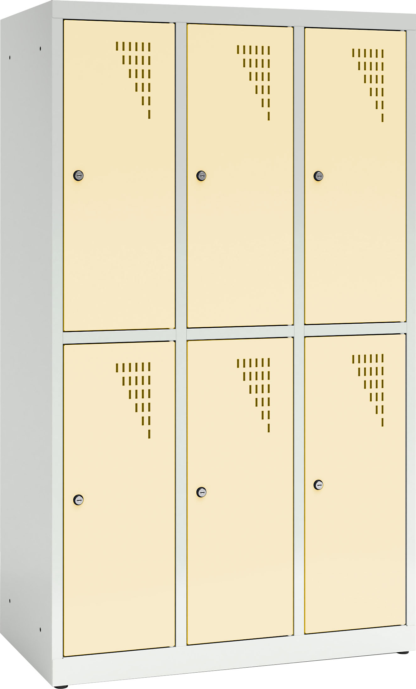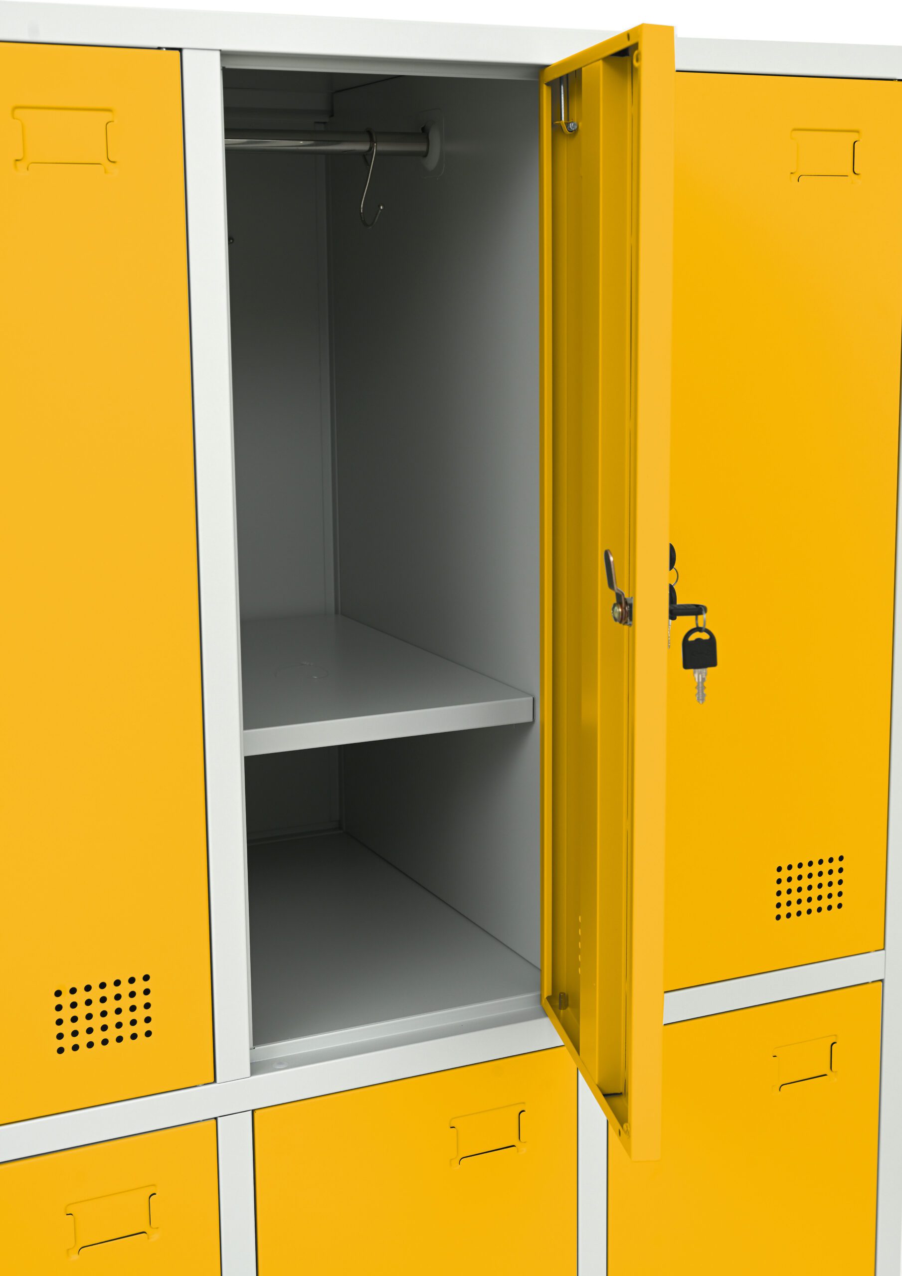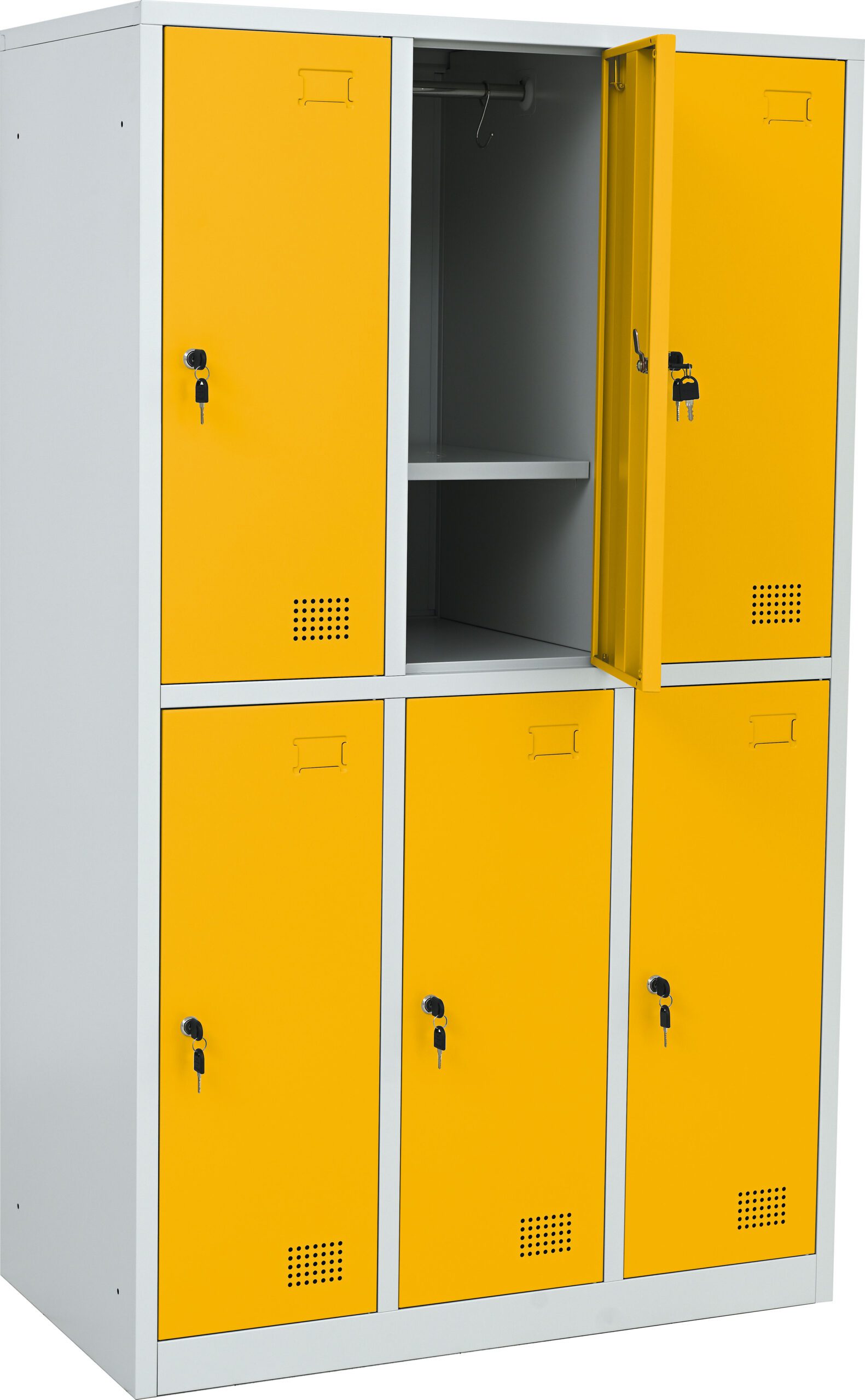 Tvirta plieninė spintelė su 6 užrakinamais skyreliais, padengta milteliniais dažais. Kiekvienos durelės turi vėdinimo angas. Spintelė užrakinama raktu (2 raktai komplekte), galima sujungti kelias spinteles arba pritvirtinti prie sienos. Viduje yra lentyna ir drabužių kabykla su 2 kabliukais.
