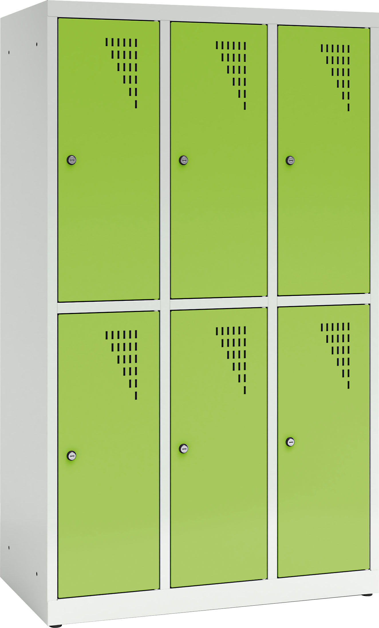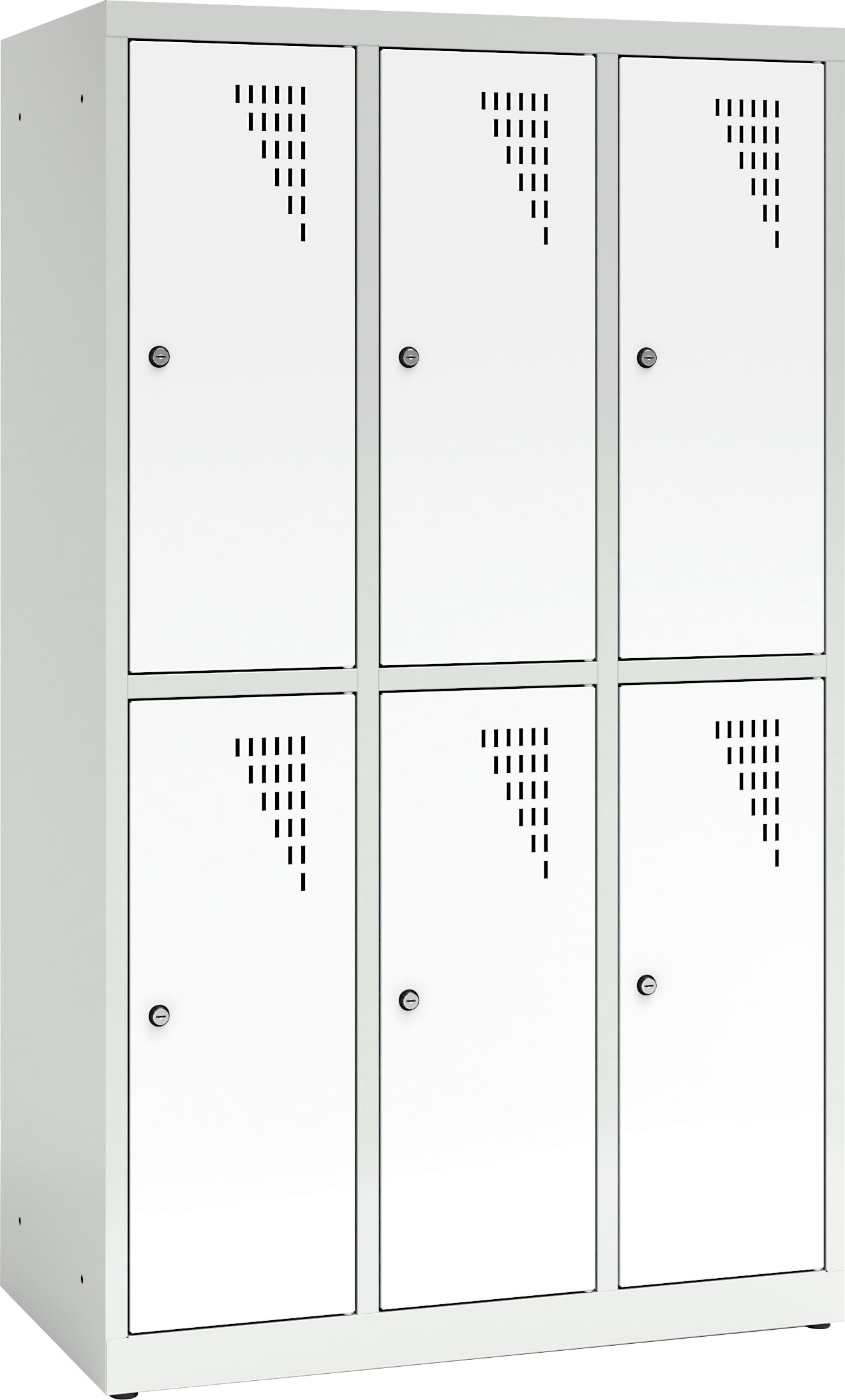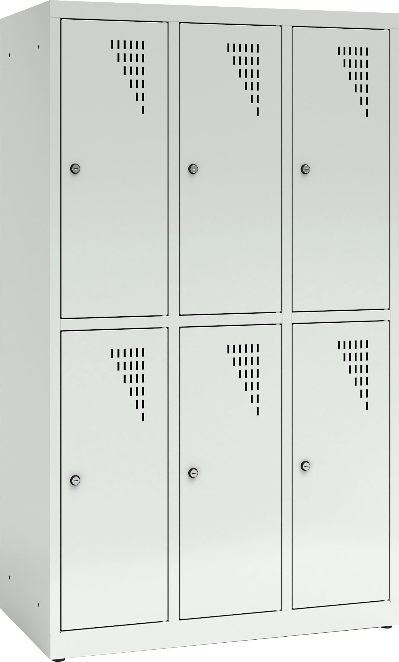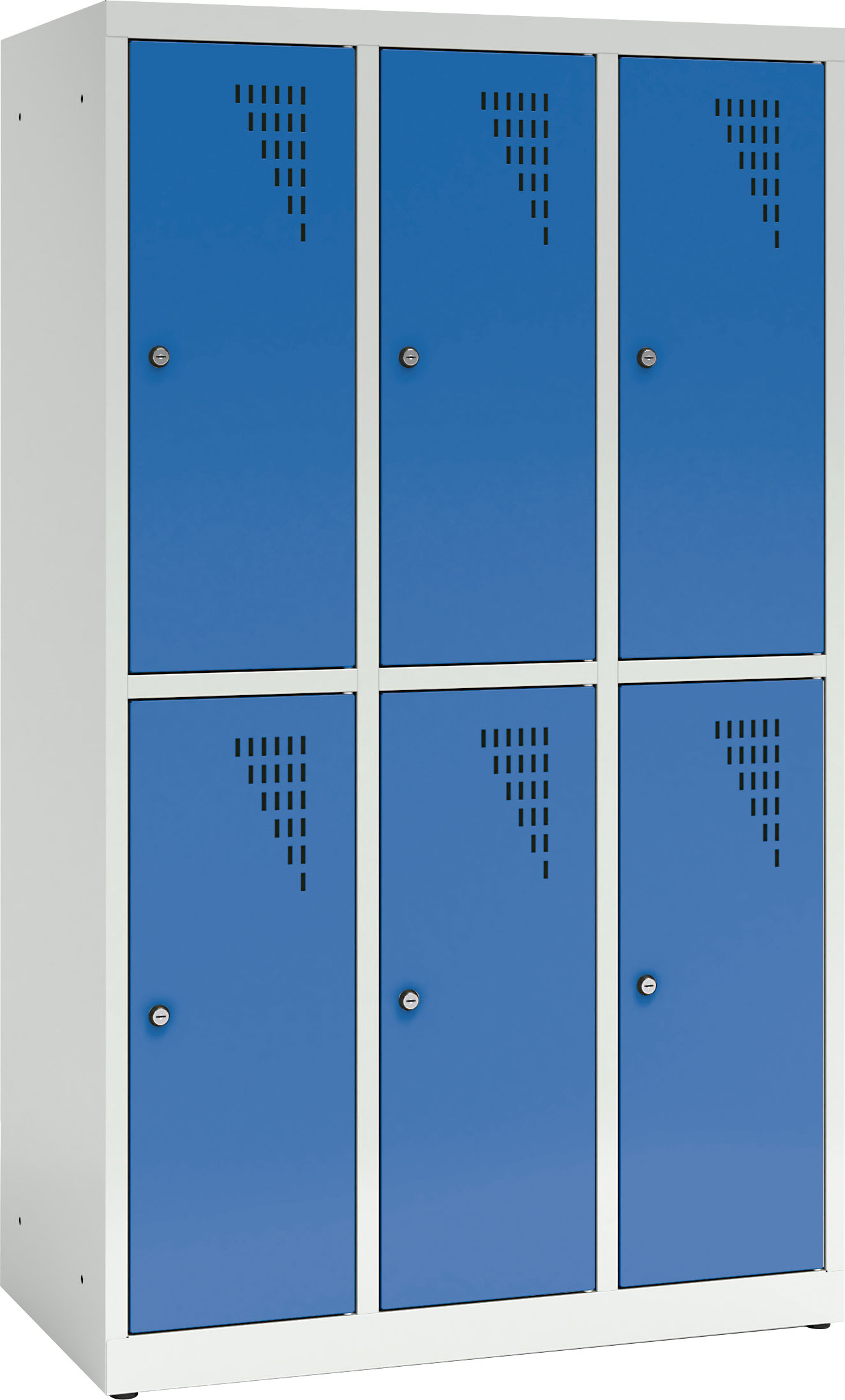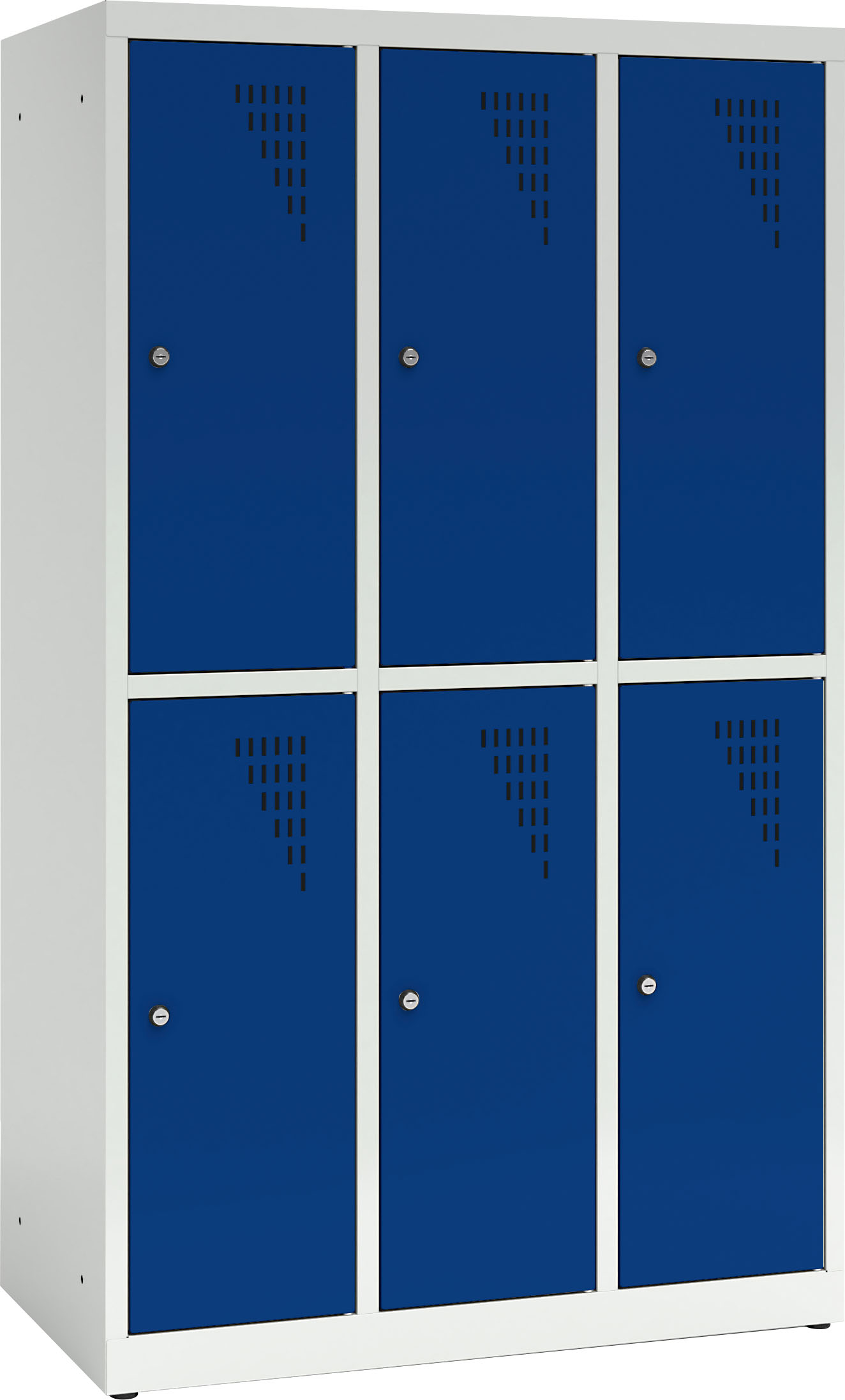 Tvirta plieninė spintelė su 6 užrakinamais skyreliais, padengta milteliniais dažais. Kiekvienos durelės turi vėdinimo angas. Spintelė užrakinama raktu (2 raktai komplekte), galima sujungti kelias spinteles arba pritvirtinti prie sienos. Viduje yra lentyna ir drabužių kabykla su 2 kabliukais.