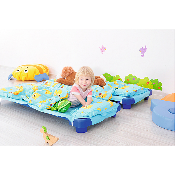 Lovelės su plienine konstrukcija ir orui pralaidžiu audiniu, puikiai tinka priešmokykliniam poilsiui. Plastikiniai kampai – lovos kojos. Dizainas leidžia lovas sukrauti viena ant kitos, todėl jas lengva laikyti.