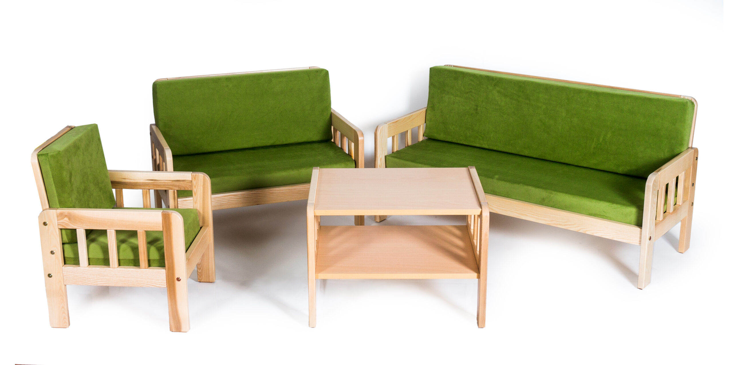 Baldai pagaminti iš natūralios kietmedžio medienos (beržas, uosis). Staliuko stalviršis – laminuota medžio drožlių plokštė. Baldų visi kampai užapvalinti vaikų saugumui.