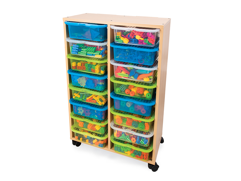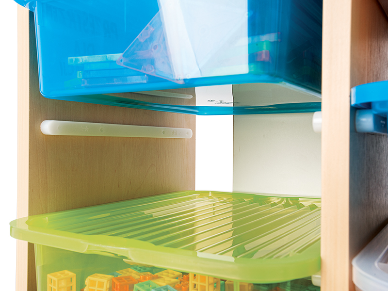 Spintos matmenys – 65,6 x 34,3 x 97 cm. Tipas: mobili. Konstrukcija pagaminta iš 18 mm storio beržo spalvos medžio drožlių plokštės. 16 talpyklų, pagamintų iš spalvoto plastiko, 36,4 x 29 x 10 cm dydžio. Papildomą spintelės įrangą sudaro 16 rūšių statybinių kaladėlių. Iš viso 2041 detalė.