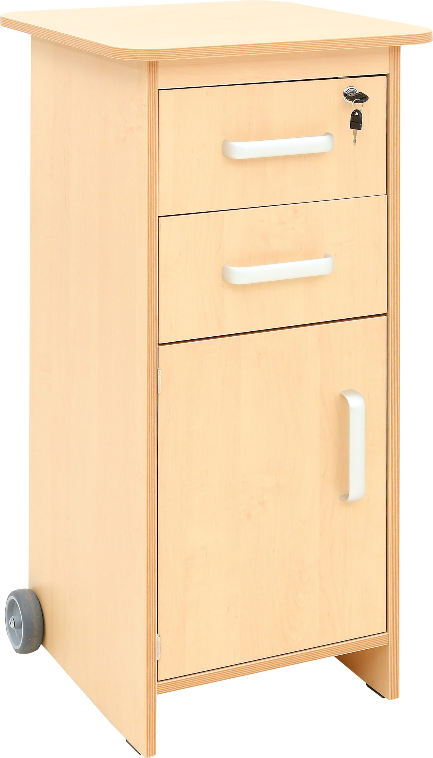 Aukšta mobili spintelė, pagaminta iš 18 mm storio beržo atspalvio laminuotos plokštės su 2 mm storio patvariu ABS daugiasluoksniu apvadu.