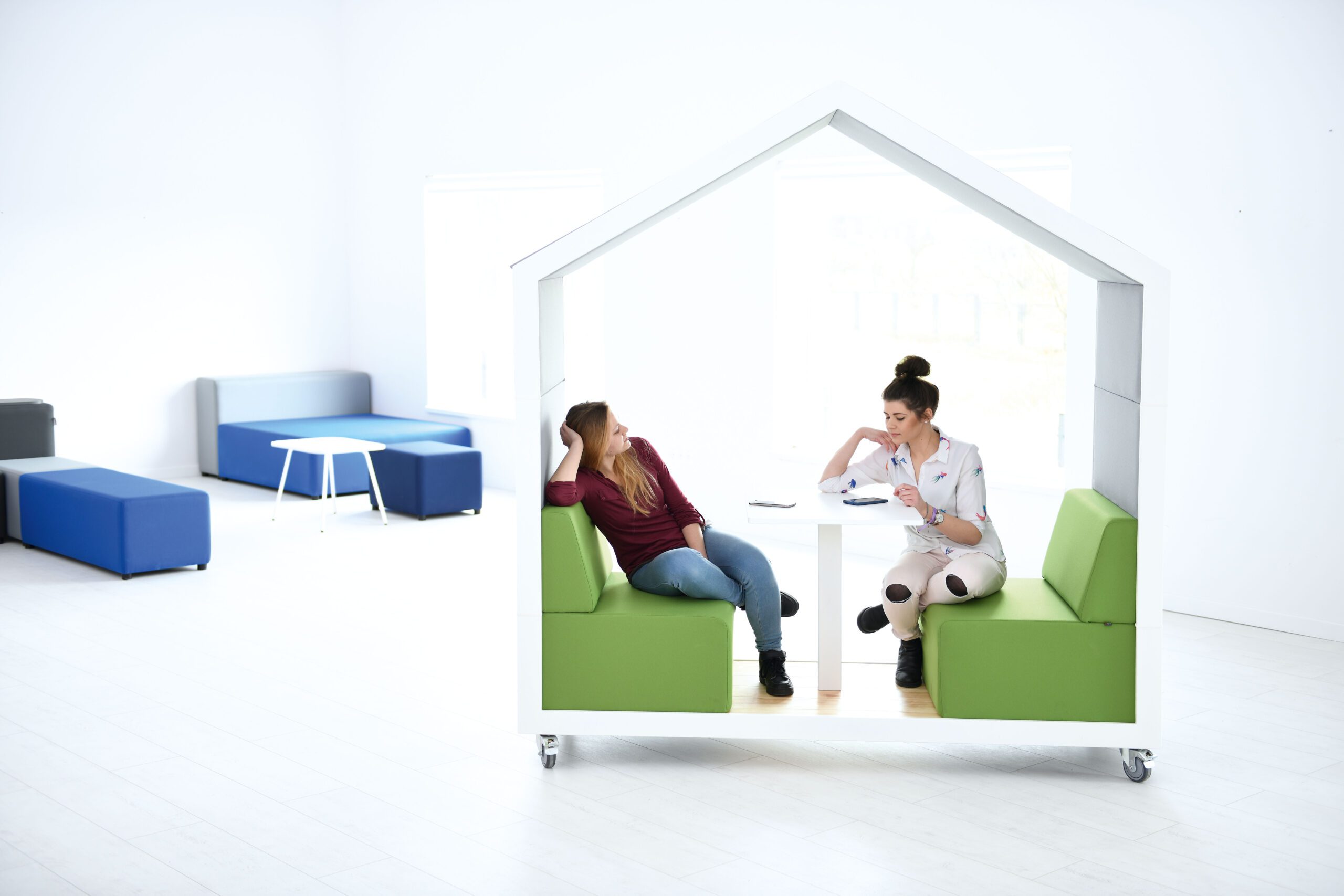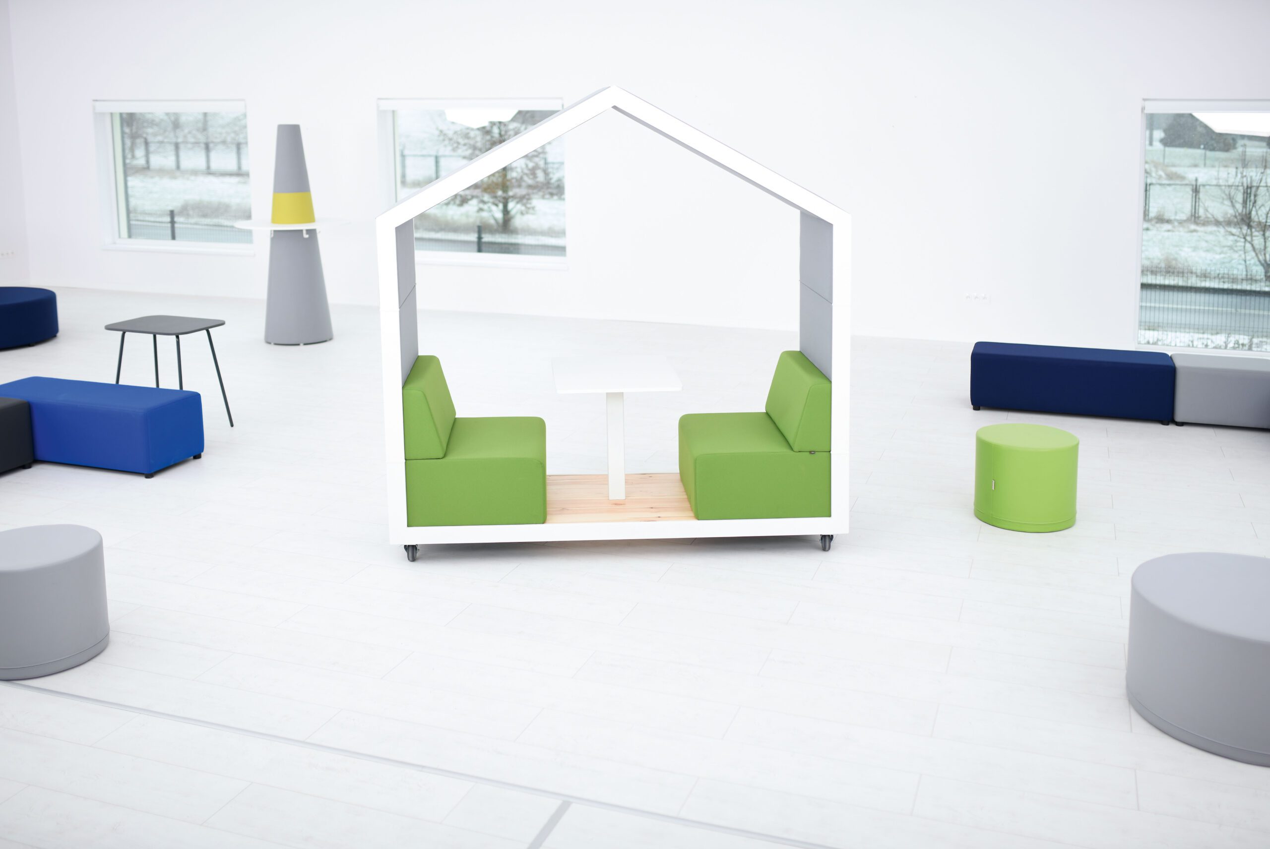 Ši poilsio erdvė – tai novatoriškas sprendimas, užtikrinantis funkcionalumą ir gerinantis akustiką švietimo įstaigose, pavyzdžiui, mokyklose ir bibliotekose. Tai šilta ir jauki konstrukcija, kuri, priklausomai nuo jūsų poreikių, sukuria draugišką atmosferą individualiam arba grupinam darbui. Jos forma primena namelį medyje, kuriame gimsta kūrybingiausios idėjos. Namas turi didelį garso sugėrimo paviršių, kuris teigiamai veikia triukšmo ir aidėjimo mažinimą visoje patalpoje.