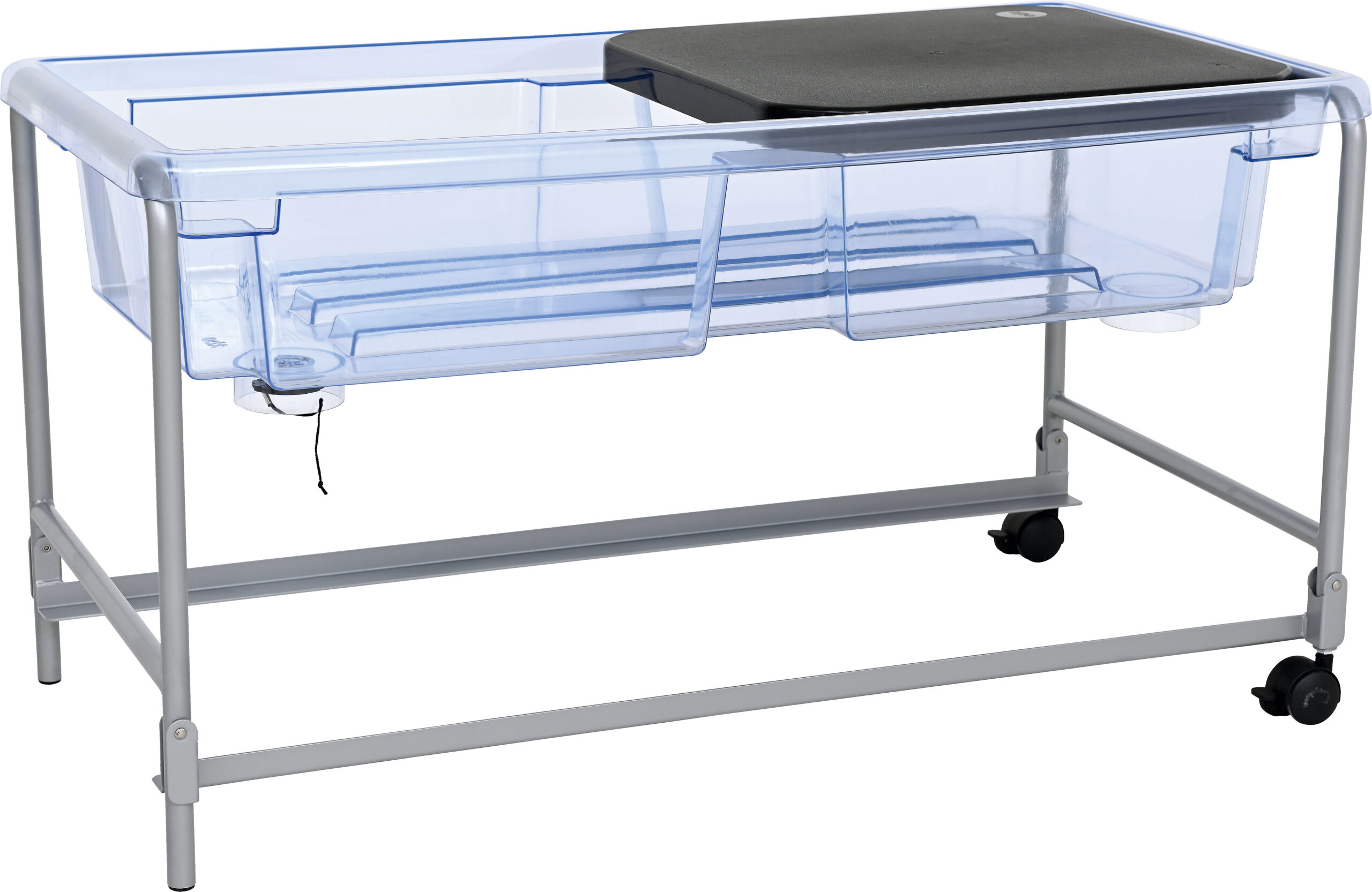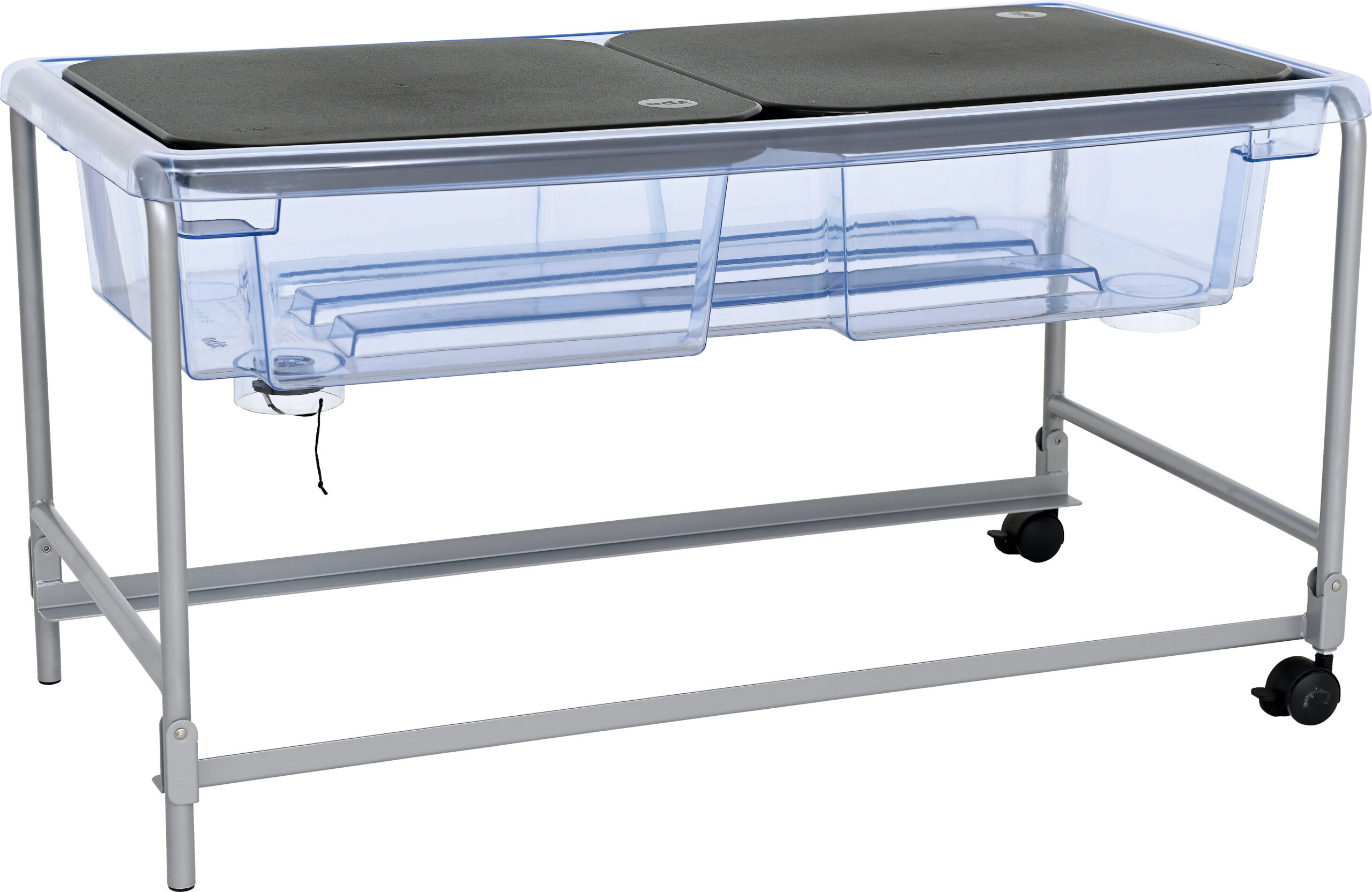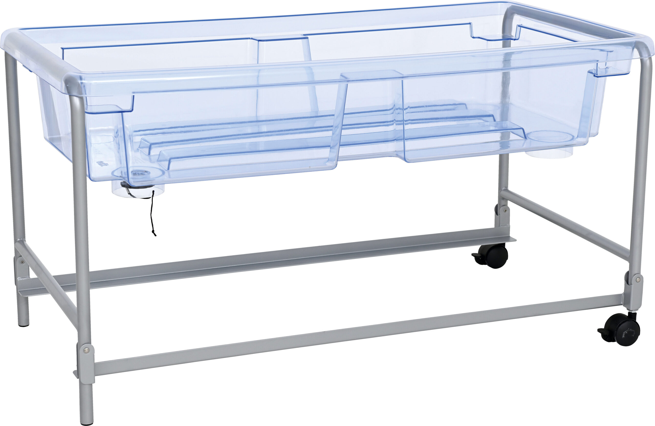 Rinkinį sudaro didelis plastikinis dėklas ant metalinio rėmo, kuriame galima žaisti įvairius žaidimus su vandeniu, smėliu ar kitomis biriomis medžiagomis. Dėka vienoje rėmo pusėje esančių ratukų talpyklą galima lengvai perkelti. Prie konteinerio pridedami 2 dangteliai.