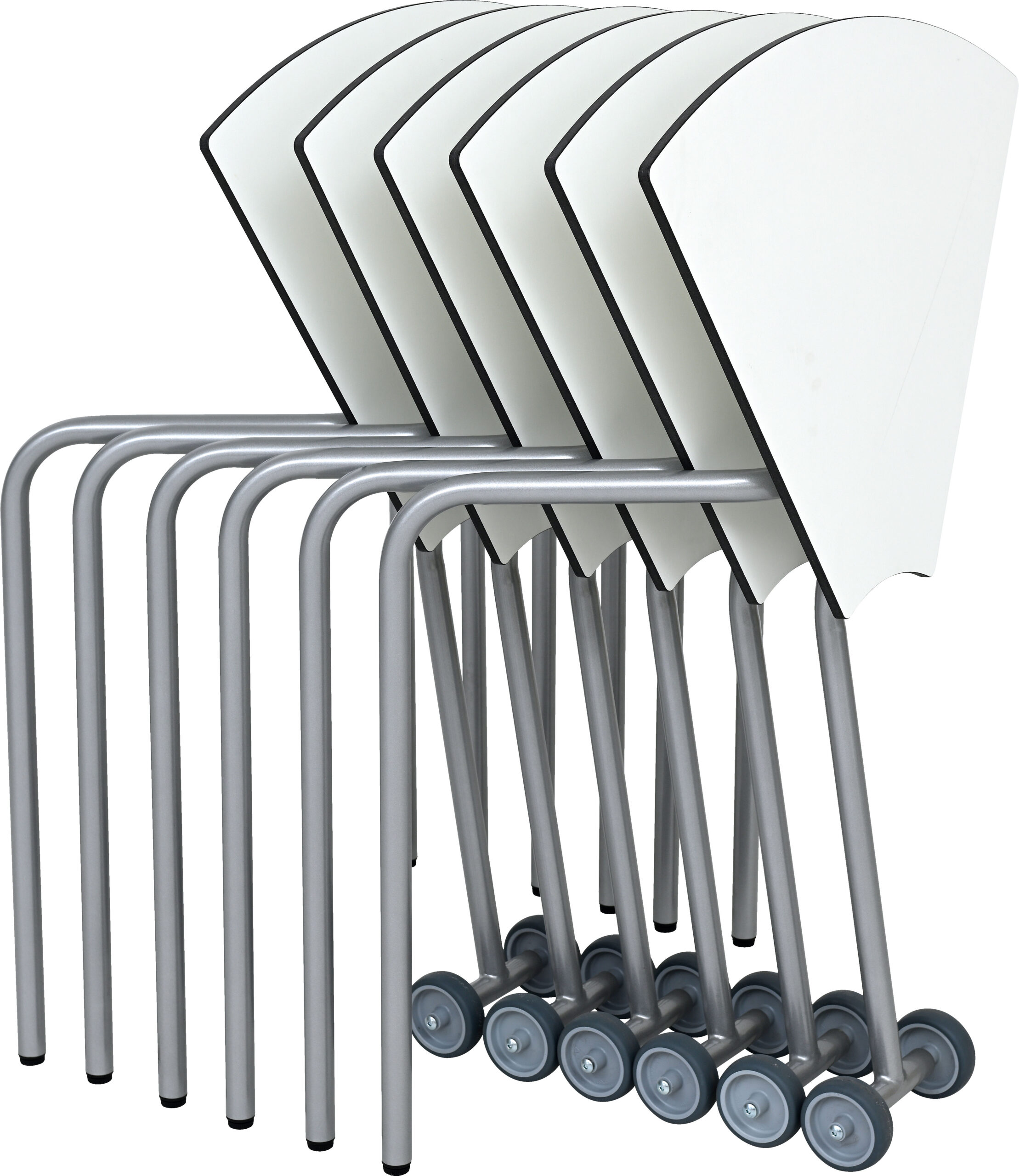 Stalo stalviršis pagamintas iš 12 mm storio CDF plokštės. Vienalytė ir kompaktiška plokštė, atspari drėgmei, vandens purslams, dėmėms ir cheminėms medžiagoms. Higieniška ir lengvai prižiūrima, atspari įbrėžimams ir trinčiai. Degumo klasė: B-s2, d0 pagal EN 13501. 32 mm skersmens metalinis rėmas su apvaliomis kojelėmis. Stalas turi ratukus patogiam stalo judėjimui ir sulankstomą stalviršį, kad būtų patogu jį sandėliuoti, stumdant stalus kartu. Galima sujungti 6 stalus ir sukurti grupinio darbo vietą.