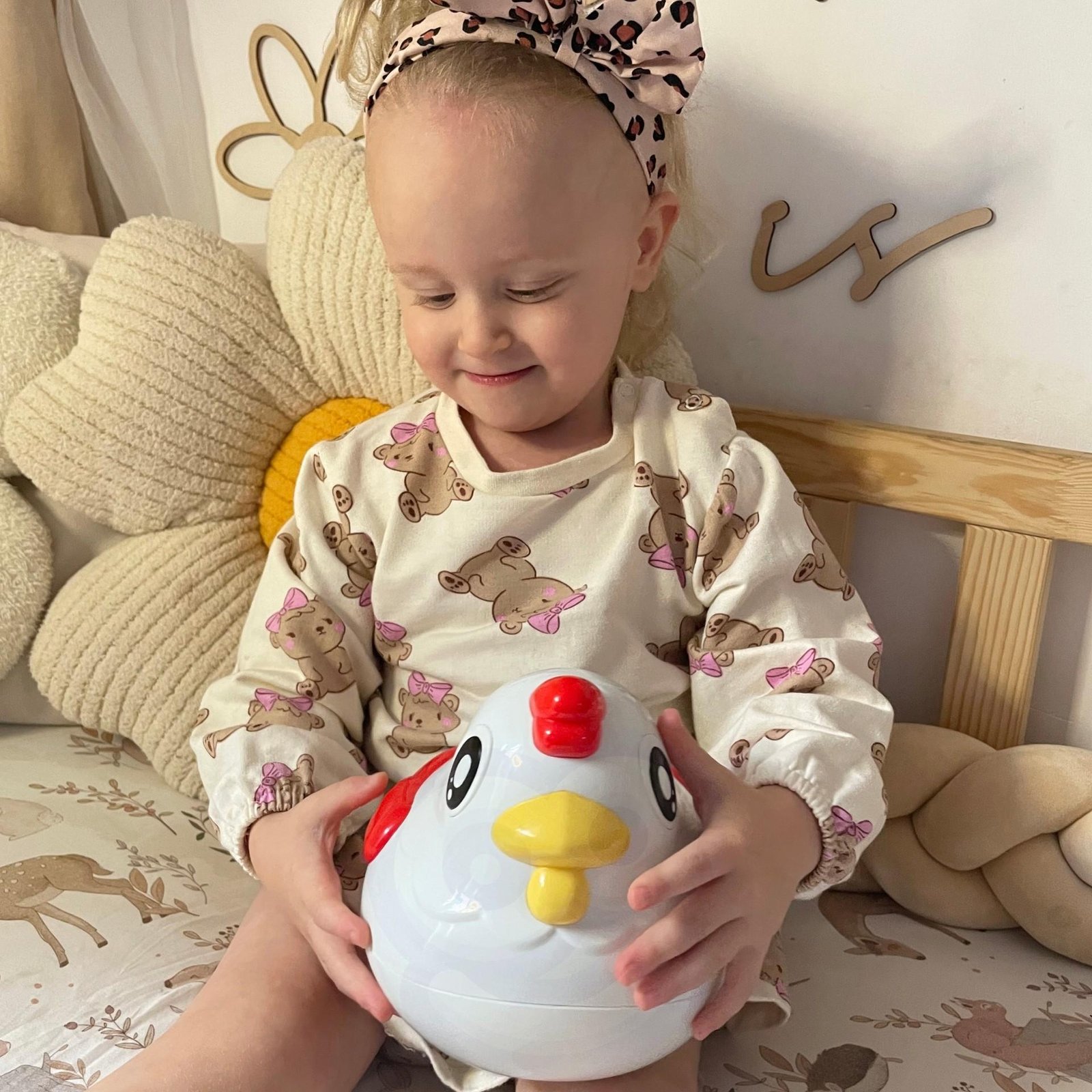 • – Žaislas leidžia laikyti elementus viduje vištos
