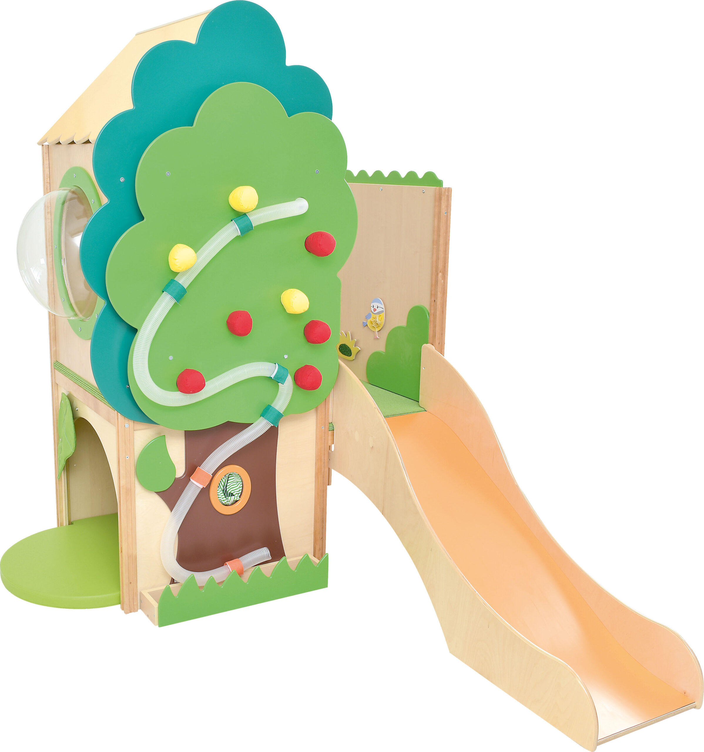 Medžio namelis suteiks daug džiaugsmo per judriuosius žaidimus. Papildomi elementai ir sensorinės aplikacijos skatina lytėjimo ir regos pojūčius bei lavina regos ir judesių koordinaciją. Pagamintas iš faneros, spalvotos MDF plokštės ir laminuotos medžio drožlių plokštės. Į komplektą taip pat įeina 8 sensoriniai pupelių maišeliai. – Mat. 151 x 92 x 212 cm – platformų aukštis: 59 ir 78 cm – šoninis įėjimas matm. 70 x 62 cm – iliuminatorius mat. 50 x 20 cm – spintelė mat. 50 x 62 x 50 cm – čiužinys mat. 116,5 x 77 x 5 cm – laiptų mat. 116 x 50 x 114 cm – šliaužyklės mat. 43 x 133 x 60 cm