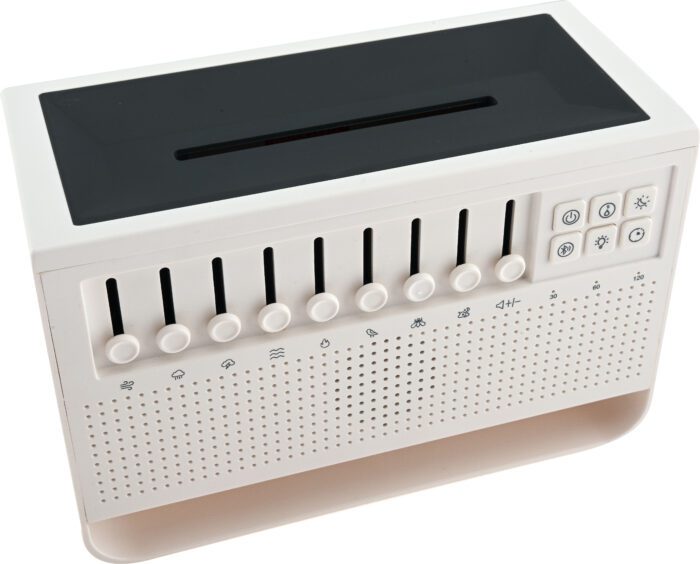 Oro drėkintuvas su gamtos garsais ir liepsnos efektu. Jis jungia drėkintuvo, lempos ir garso grotuvo funkcijas. Įpylus vandens, jis švelniai skleidžia rūką, padėdamas išlaikyti optimalų oro drėgnumą. Jis skleidžia realistišką LED liepsnos efektą. Septyni gamtos garsai, tokie kaip audros, lietaus ir upelio garsai, paukščių čiulbėjimas ir švelni melodija, gali būti grojami atskirai skirtingu garsumu arba derinami bet kokia kombinacija, kad būtų sukurti unikalūs kūriniai. Garso atkūrimas skatina ramybę, mažina stresą ir nerimą bei padeda ugdyti klausos suvokimą. Įkraunamas per USB-C laidą.
