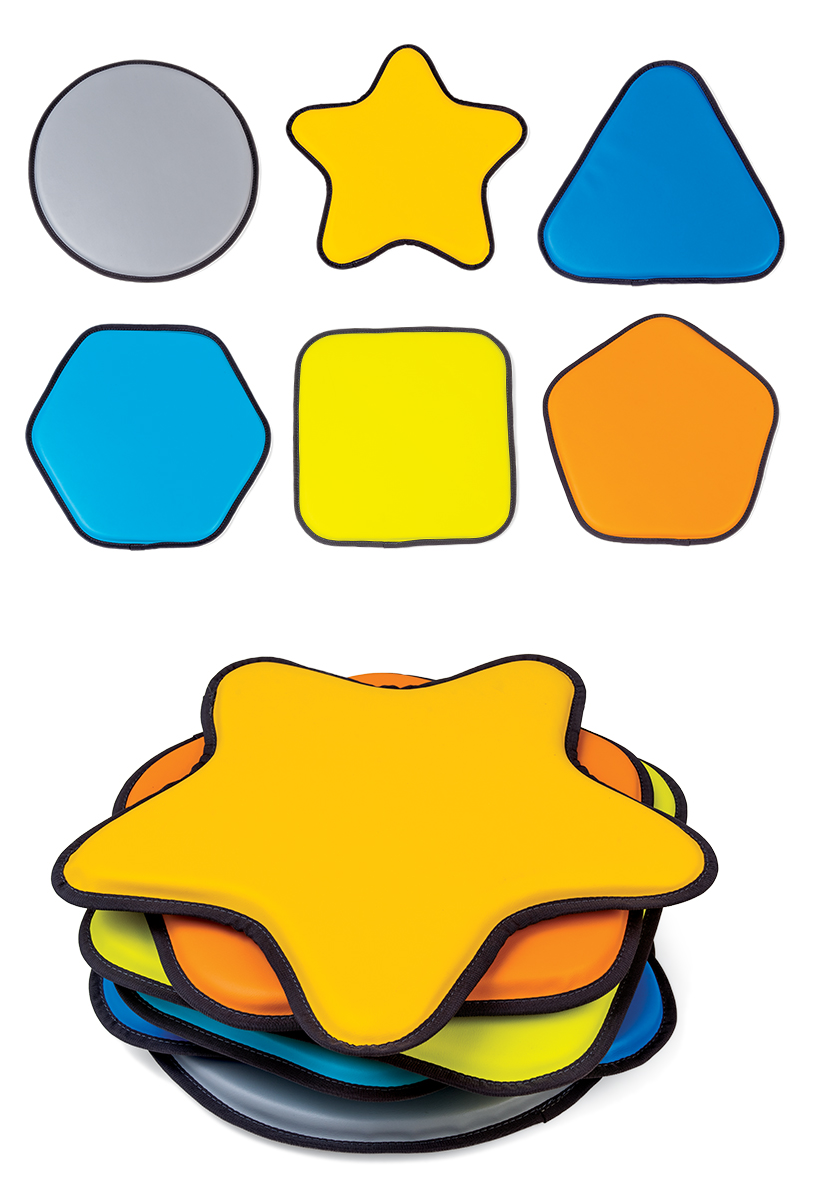 6 vnt.: kvadratinis 32x2x32cm; ratas 34x2x34cm; trikampis 35,5x2x32,4 cm; penkiakampis 34,6x2x33,5 cm; šešiakampis 35,1x2x32; žvaigždė. 38x2x36,4 cm; medvilninės juostos apdaila; viršelis: trinčiai atsparus PVC audinys be ftalatų; užpildas: labai elastingos poliuretano putos