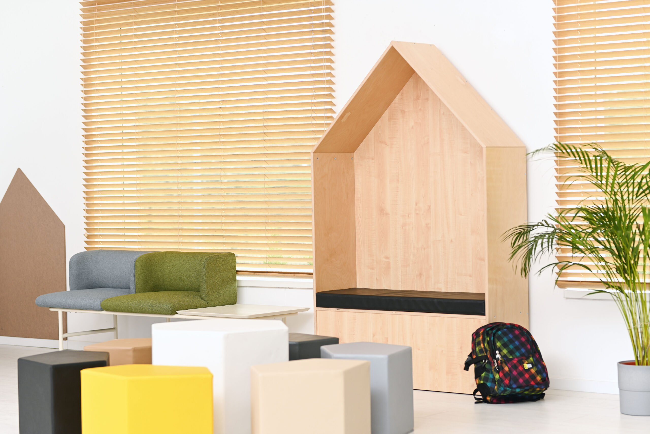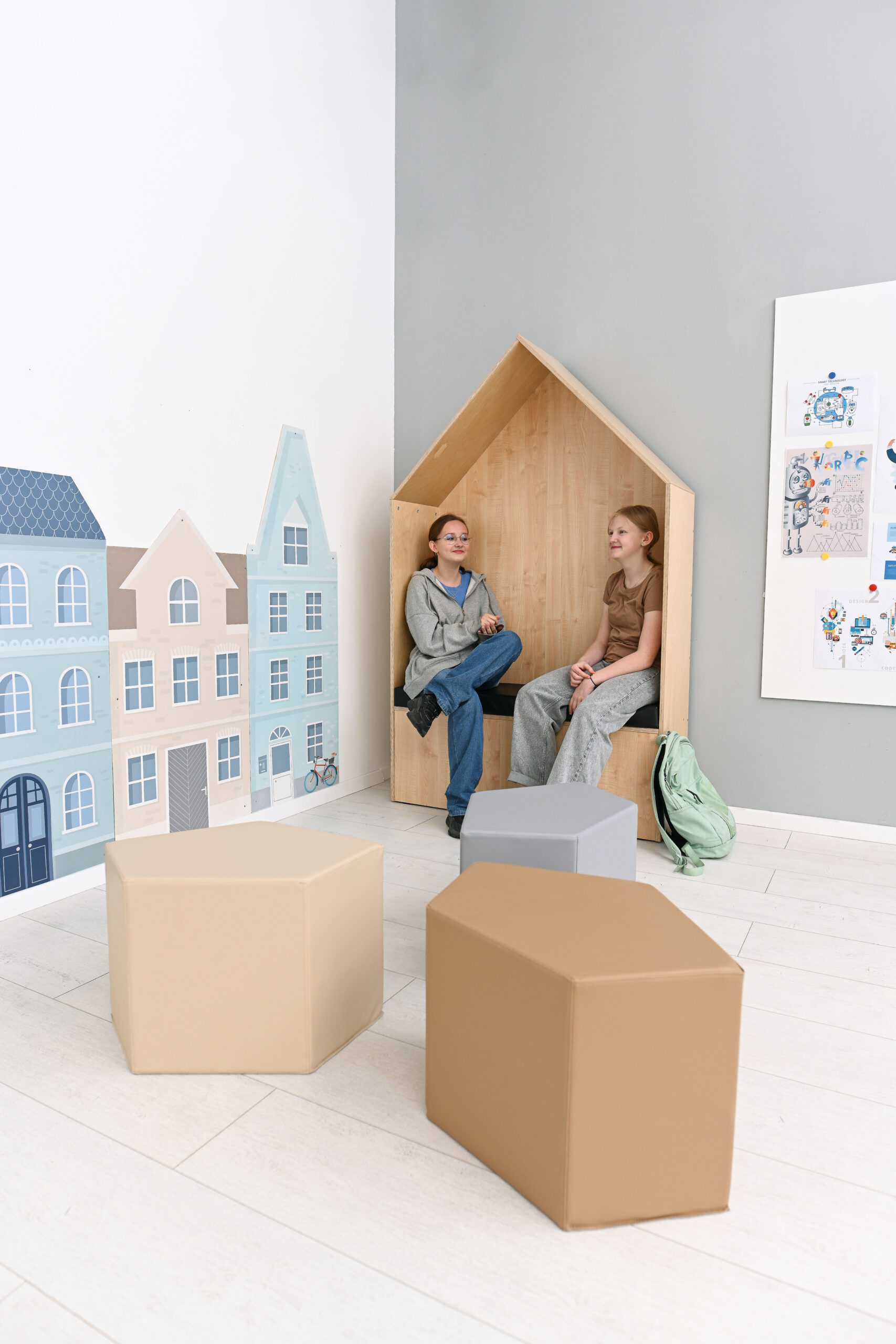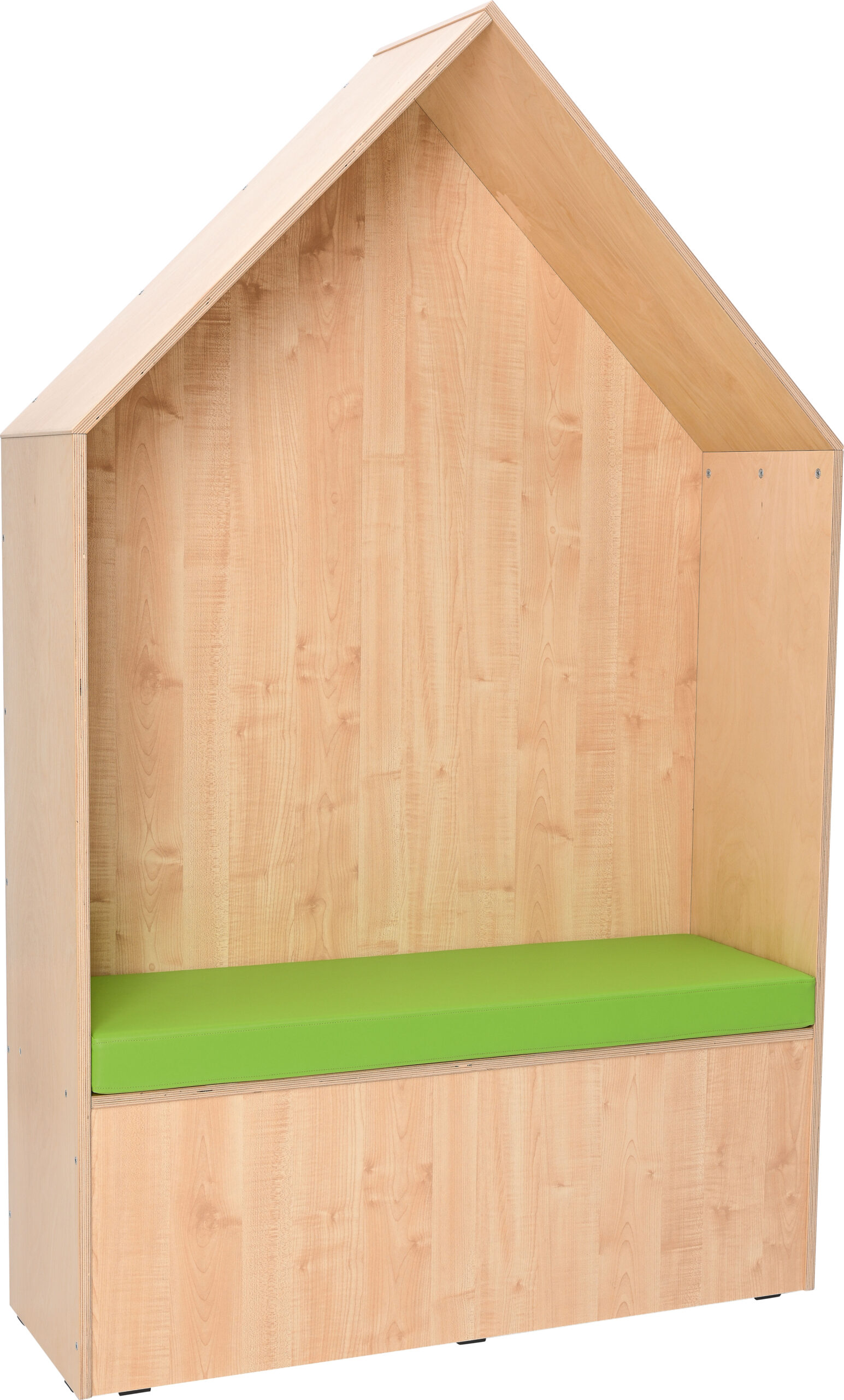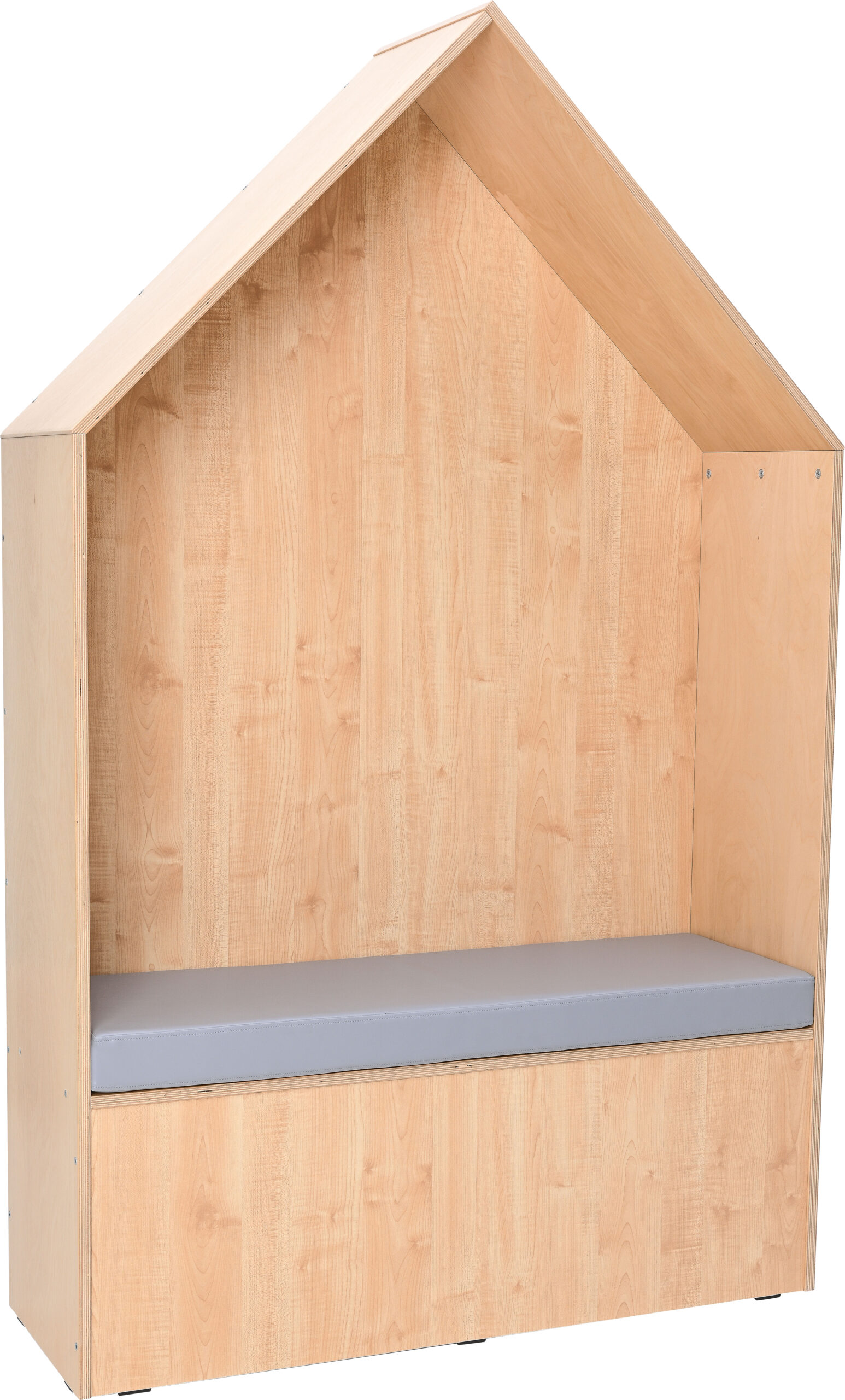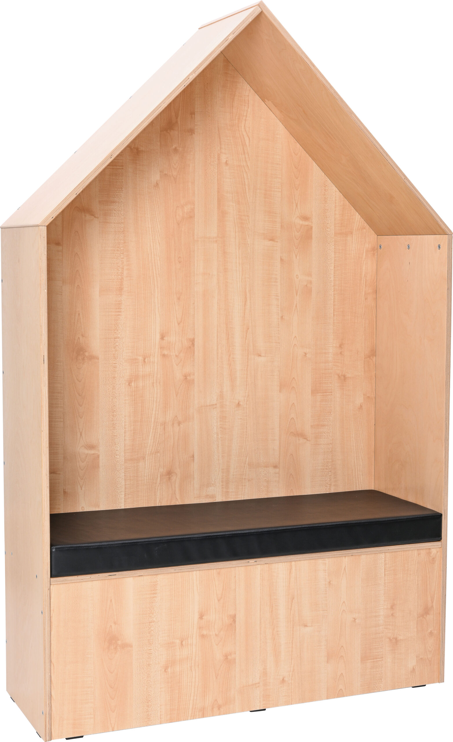 Stogas, šonai ir sėdimoji dalis pagaminti iš 18 mm storio faneros, o priekinė ir galinė sienelės – iš 18 mm storio medžio drožlių plokštės. Visa konstrukcija išlaikyta šviesaus klevo atspalvyje. Namelis turi patogų čiužinį, ant kurio vaikai gali prisėsti ir atsipalaiduoti prieš kitas pamokas.