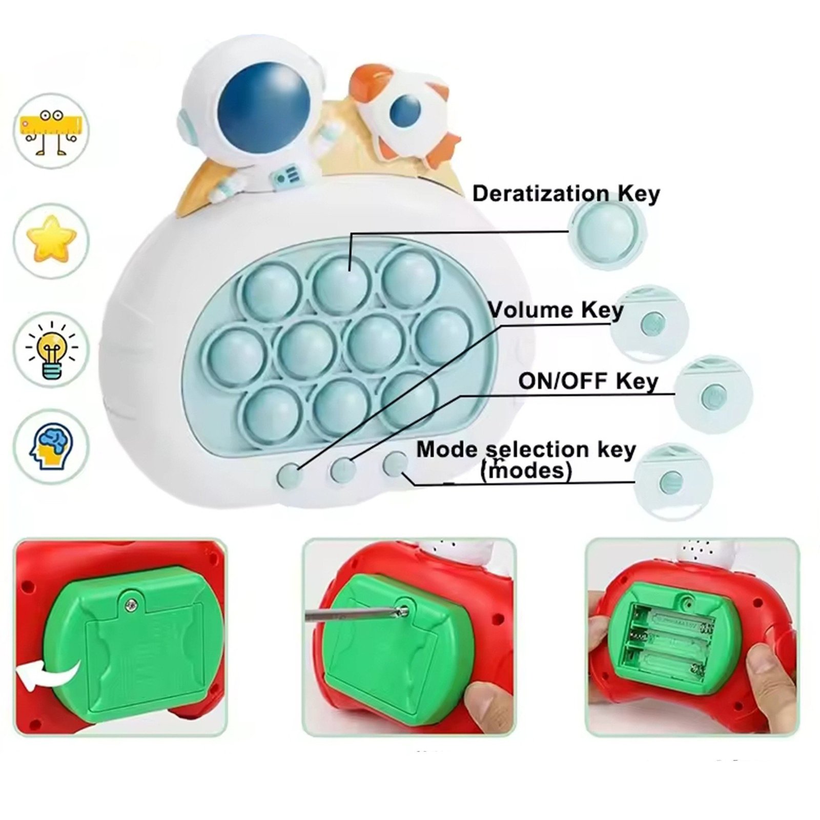 POP IT Kosmosas – streso mažinimo žaislas vaikams nuo 3 metų. Lavina protą, rankų įgūdžius, akių-rankų koordinaciją ir stebėjimą. Rinkinys turi 4 žaidimo režimus: atminties, taškų rinkimo, daugelio žaidėjų ir išsiveržimo režimą. Mažas ir lengvai nešiojamas, su linksmais garsais, skatina žaisti tiek vaikams, tiek suaugusiems.