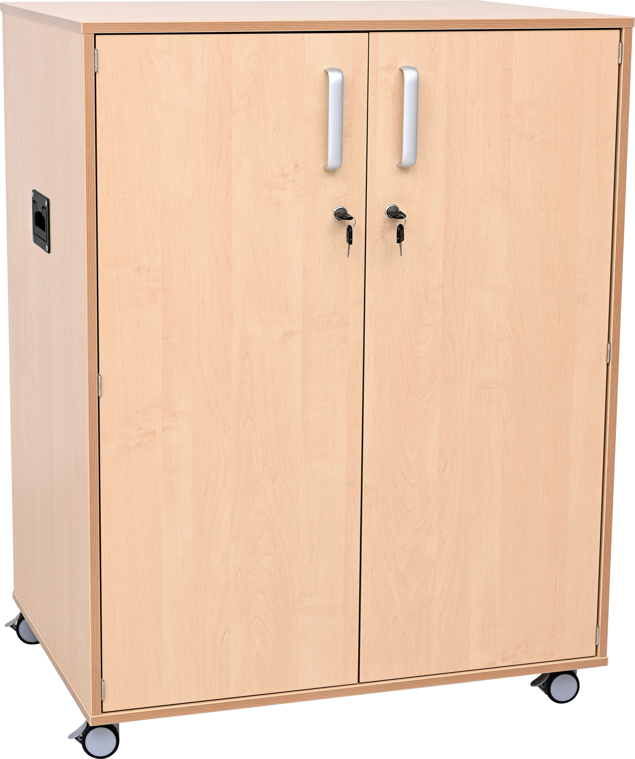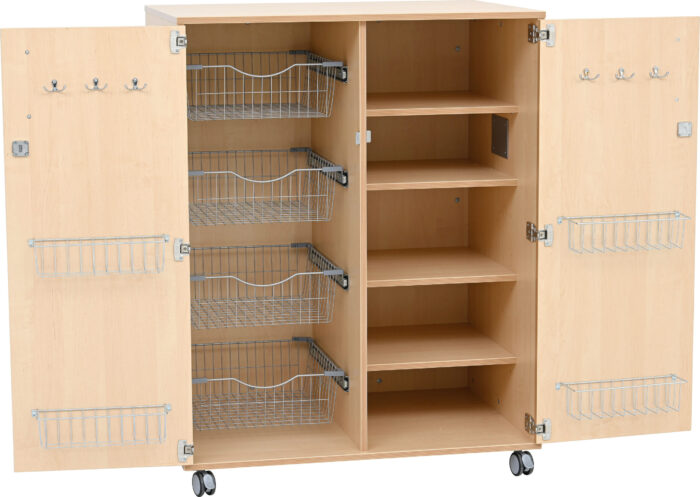 Mobili spintelė pagaminta iš 18 mm storio laminuotos plokštės su ABS apvadu. Įrengtos 4 lentynos, 4 ištraukiami krepšiai ir 2 krepšiai bei kabliukai ant abiejų durų. Spintelės šonuose yra rankenėlės, kad baldą būtų galima lengvai perkelti.
