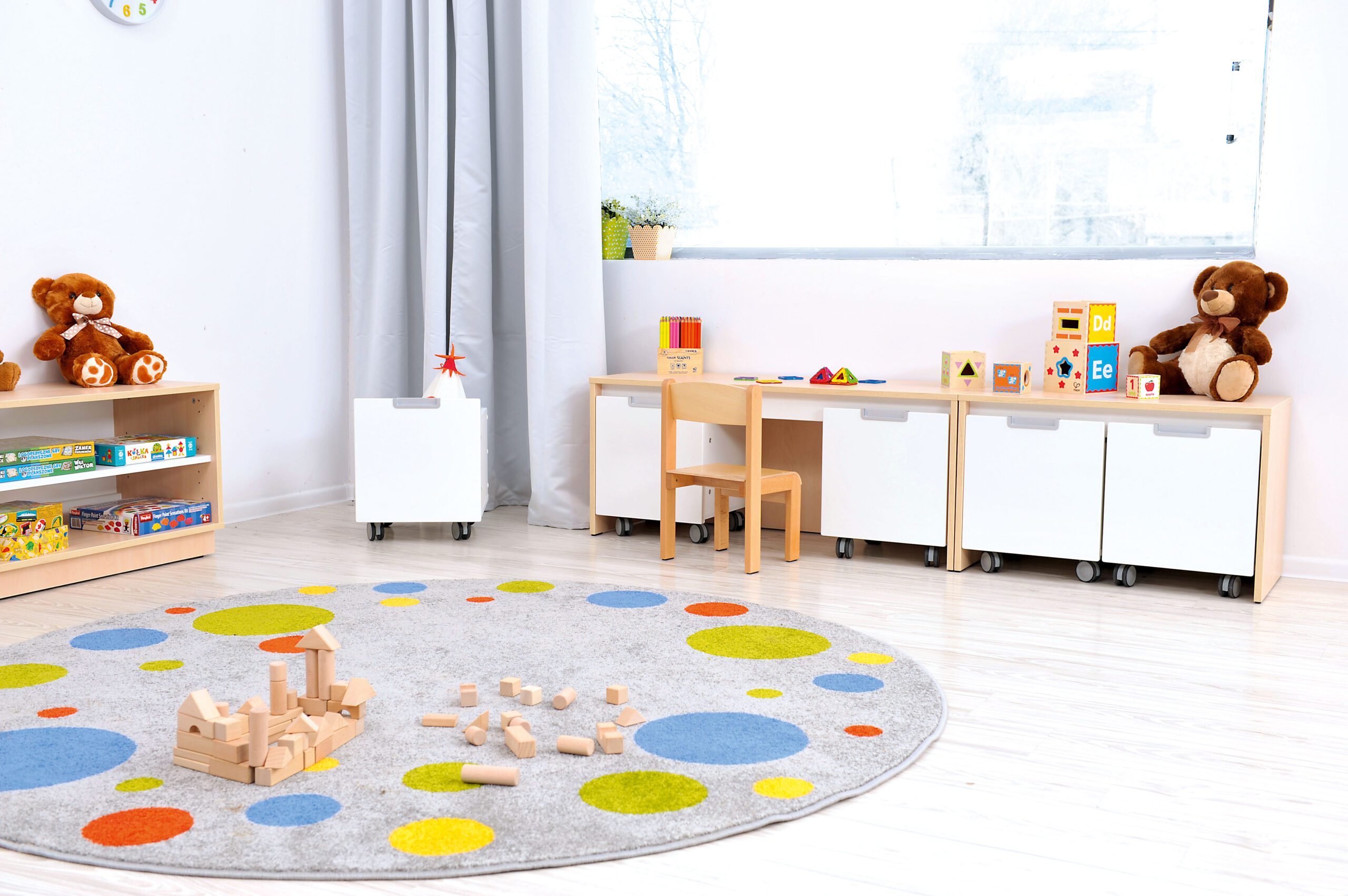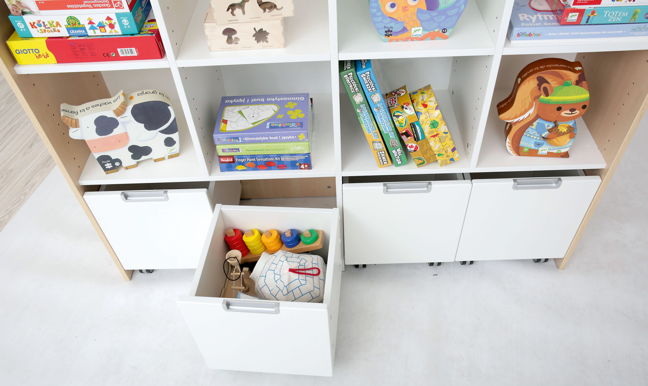 Erdvios dėžės su ratukais, kad jas būtų galima lengvai ištraukti. Pagamintos iš baltos laminuotos 18 mm storio plokštės, priekinė dalis iš 18 mm storio MDF plokštės, padengtos patvaria termoplastine fanera.