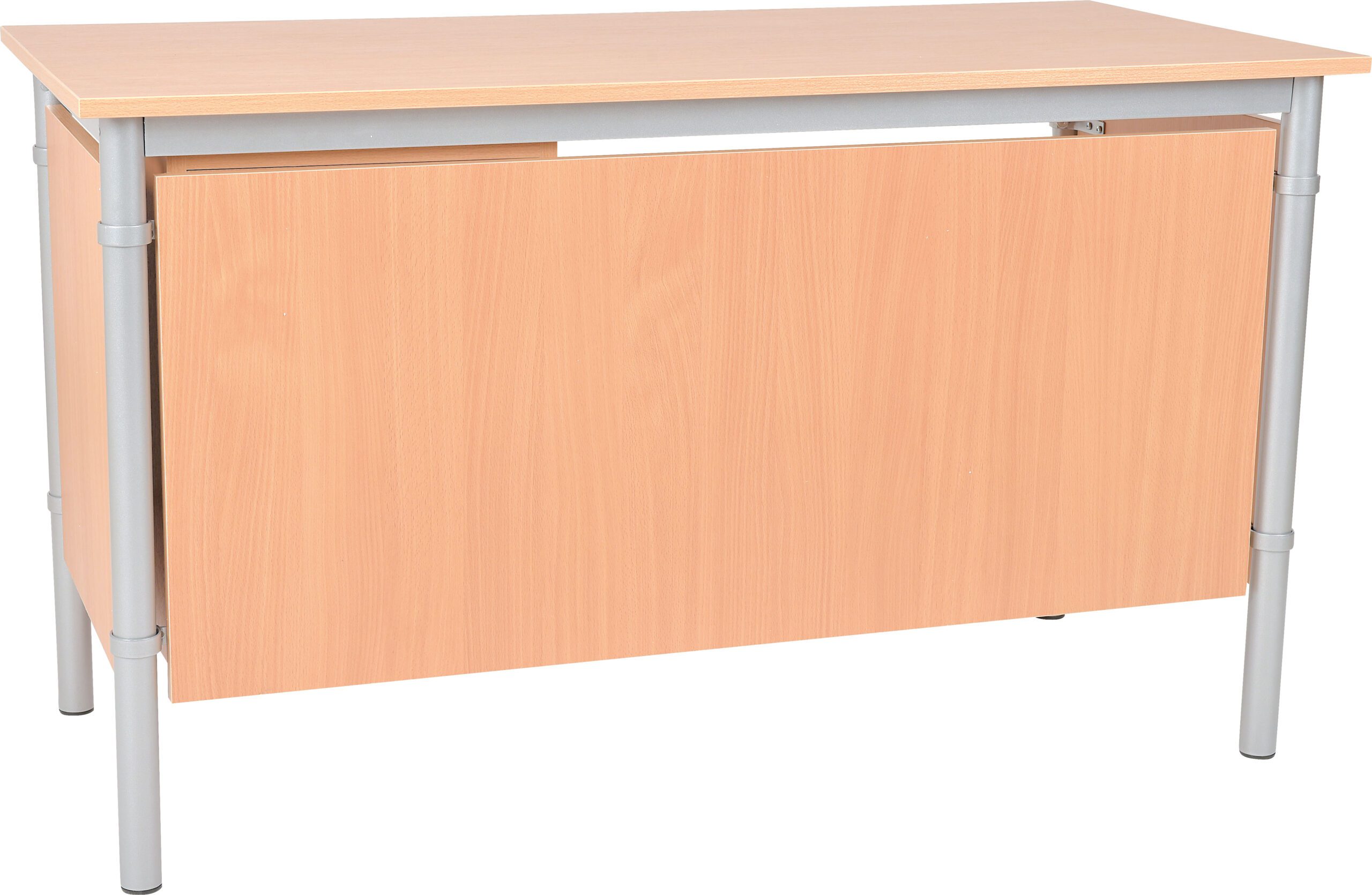 Tvirtas mokytojo stalas su metaliniu rėmu ir pakabinama spintele. Komplektą sudaro: stalas (130 × 60 × 76 cm), trijų šoninių pertvarų rinkinys ir pakabinama spintelė su spynomis. Baldai pagaminti iš laminuotos plokštės (18 mm), bukmedžio atspalvio, su 2 mm ABS briaunomis. Metalinis rėmas – iš 40 × 20 mm profilio ir 40 mm skersmens vamzdžio. Idealiai tinka mokytojams ar biurams.