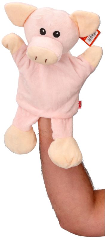 Minkšta, pūkuota ūkio gyvūno formos rankinė lėlė.
