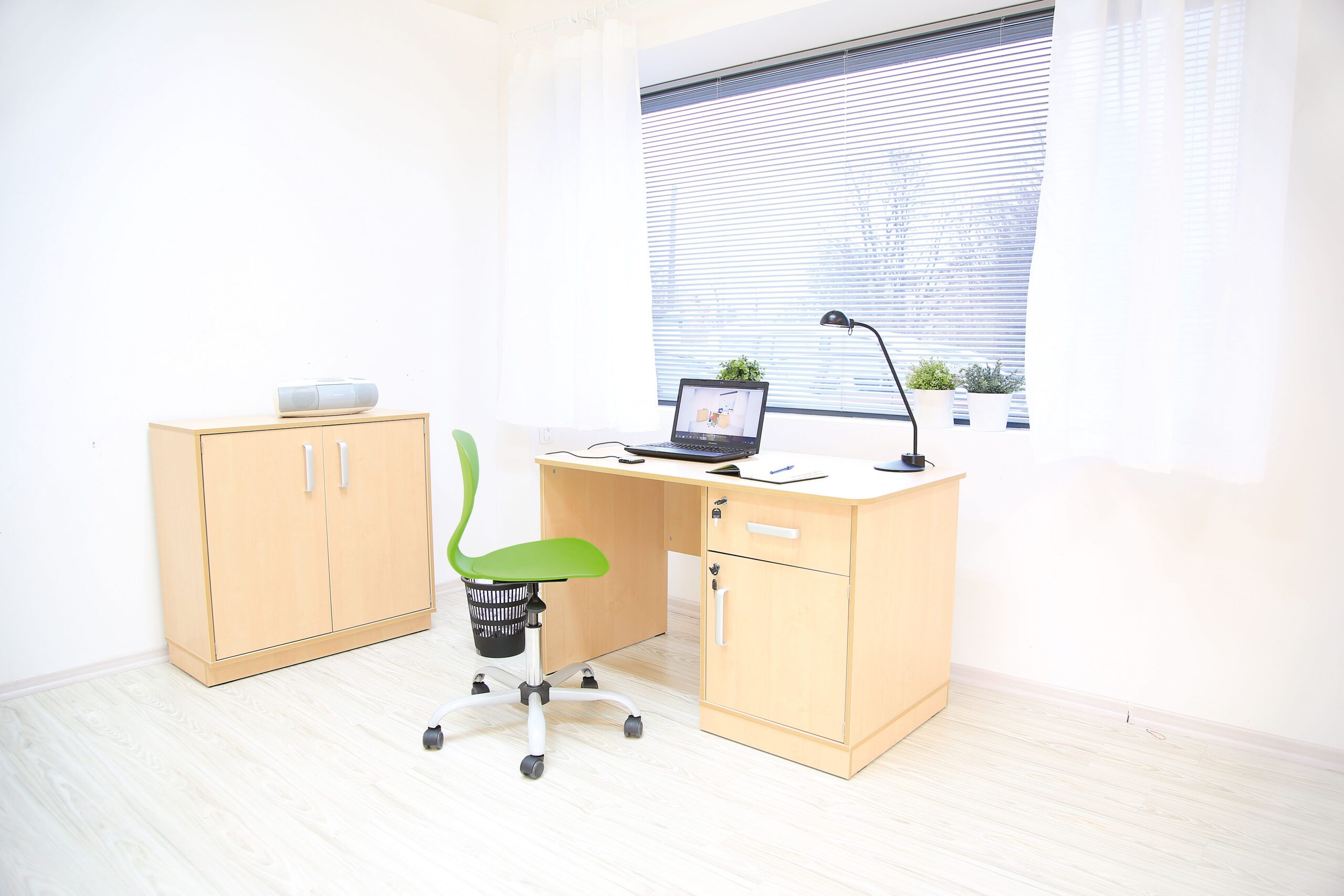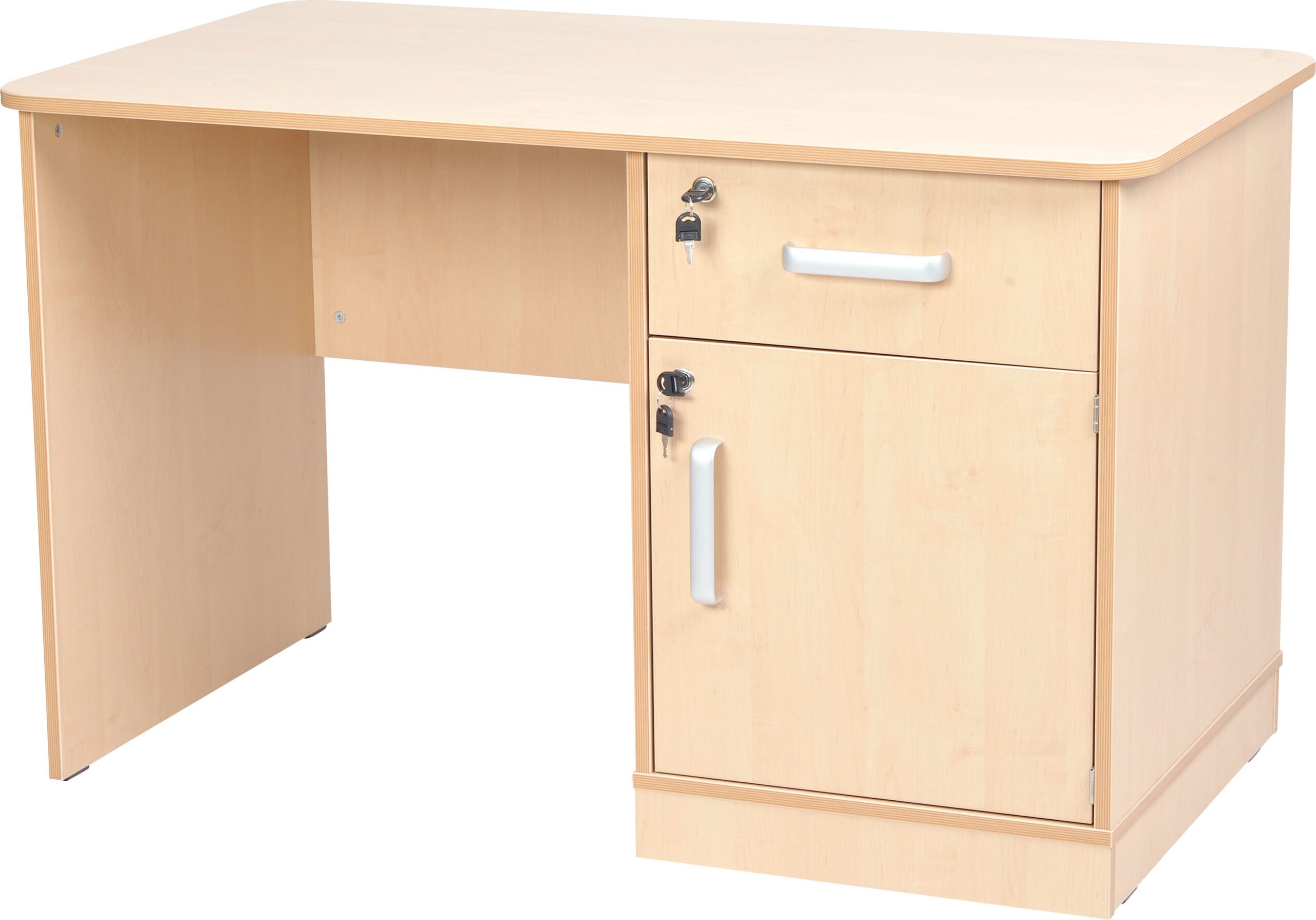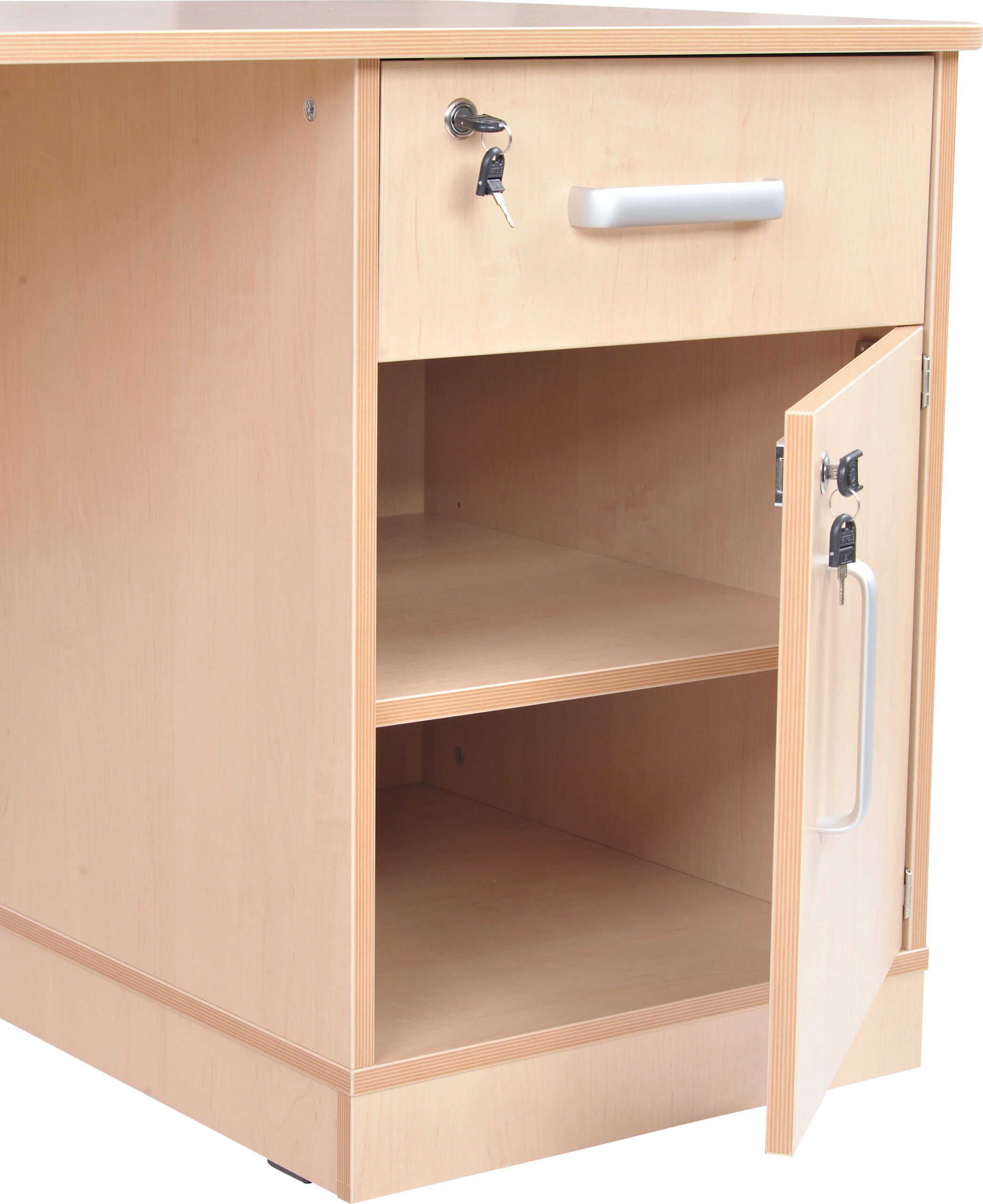 Įrengta spintelė ir stalčius – abu rakinami. Viena lentyna spintelės viduje. Pagaminta iš 18 mm storio laminuotos beržo atspalvio beržo plokštės su 2 mm ABS daugiasluoksne briaunų juosta.