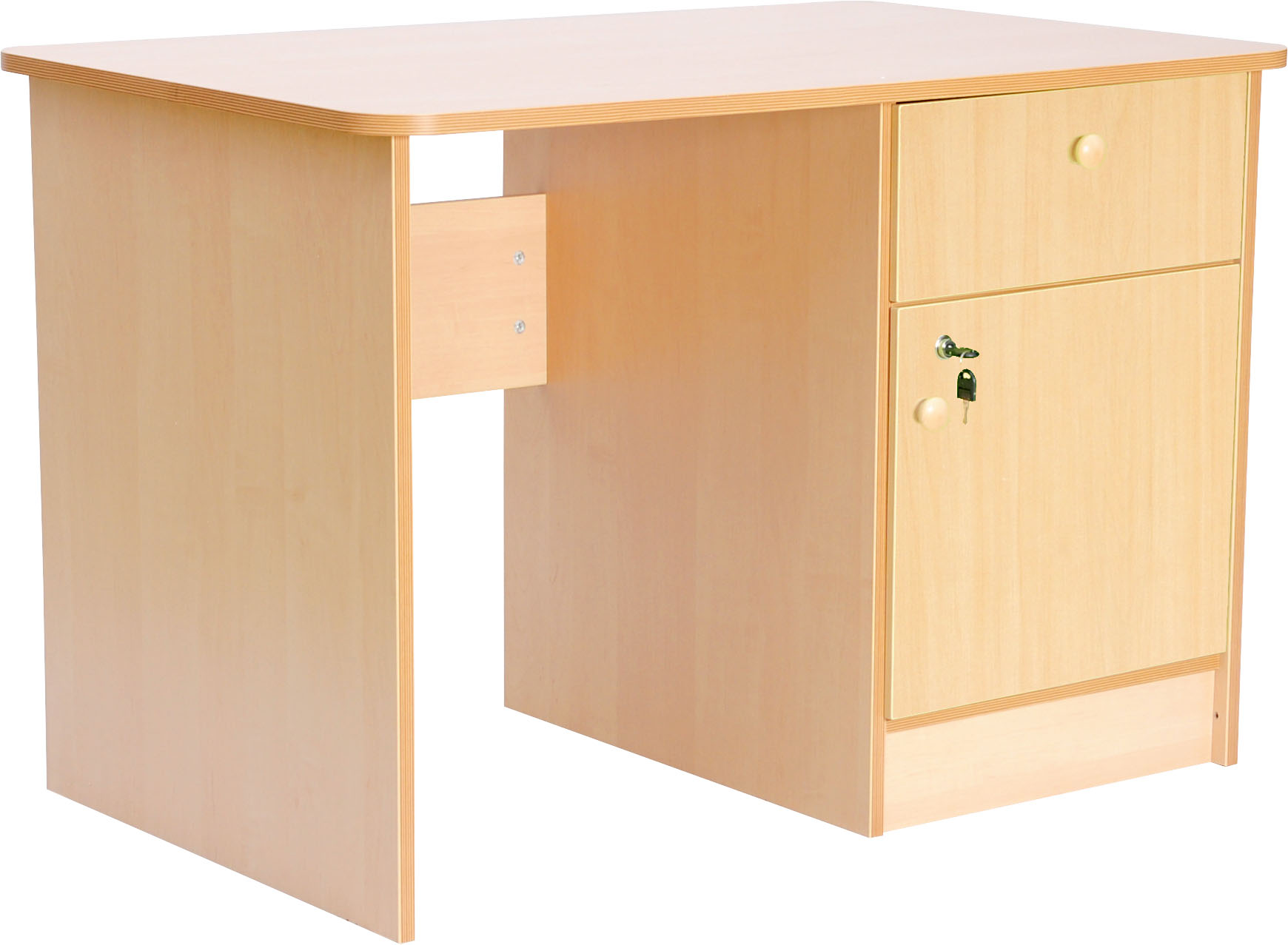 Rašomasis stalas, pagamintas iš 18 mm beržo atspalvio laminuotos plokštės su spalvotais arba beržo MDF elementais. Įrengtas stalčius ir spintelė su užraktu.