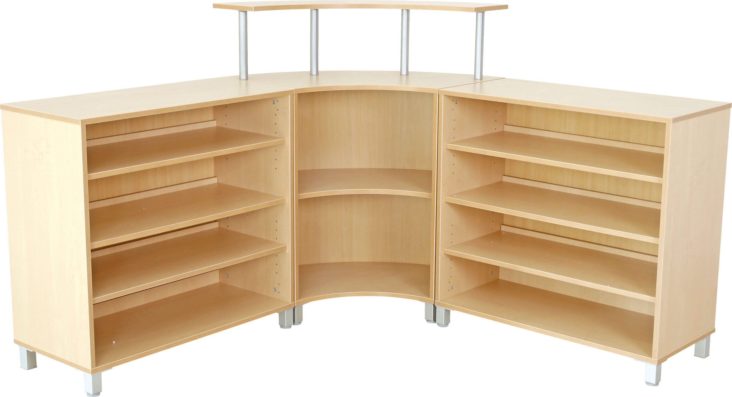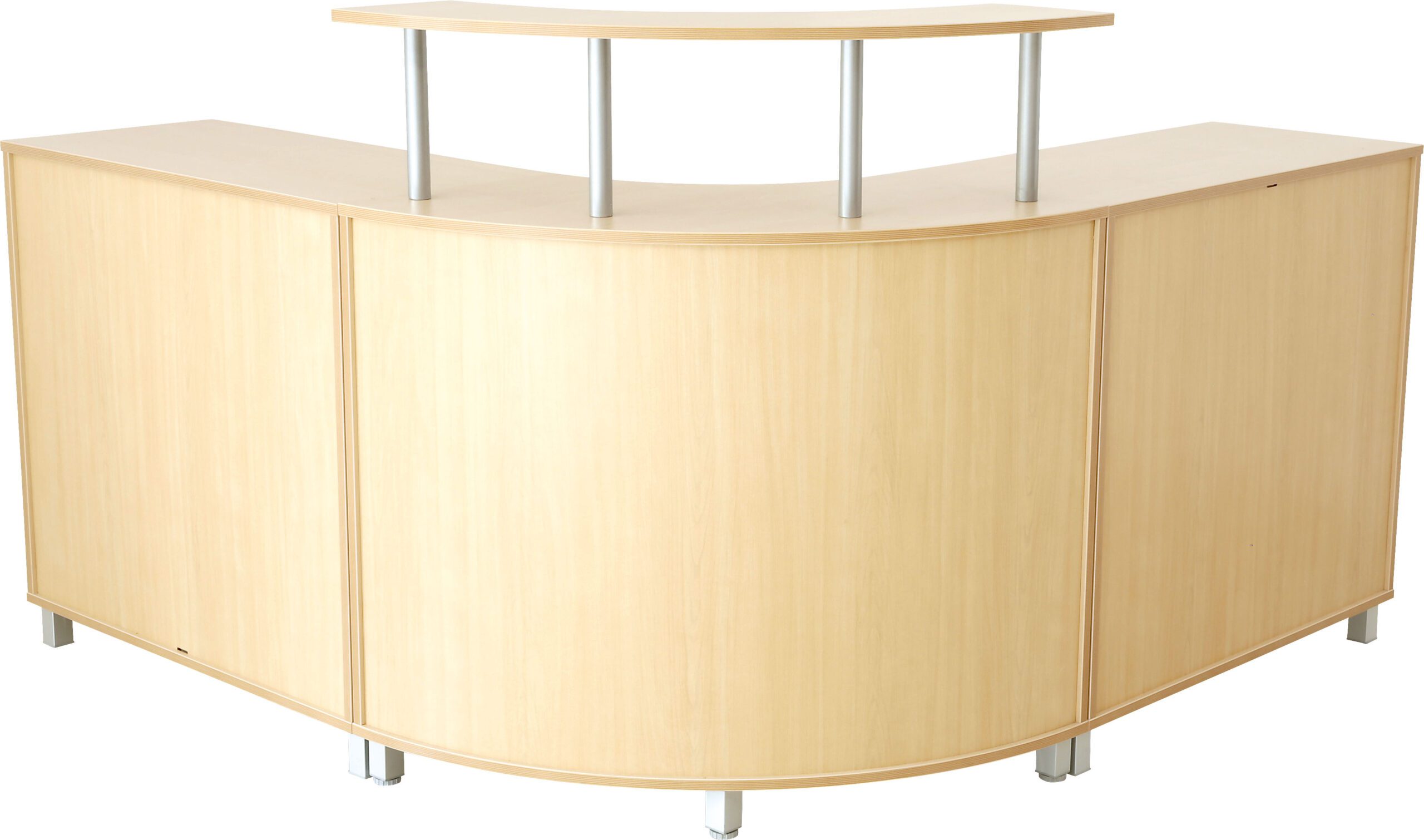 Modernus ir funkcionalus recepcijos baldų komplektas, pagamintas iš 18 mm storio laminuotos medžio drožlių plokštės. Komplektą sudaro vienas recepcijos stalas bei dvi trijų lentynų spintelės su kojelėmis. Baldai puikiai tinka priėmimo zonoms, biurams ar mokymo įstaigoms.