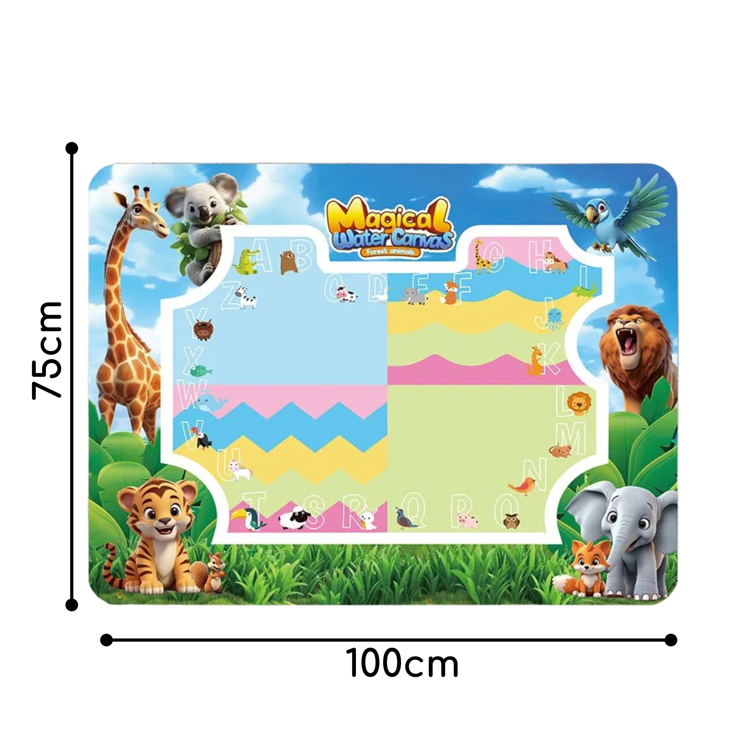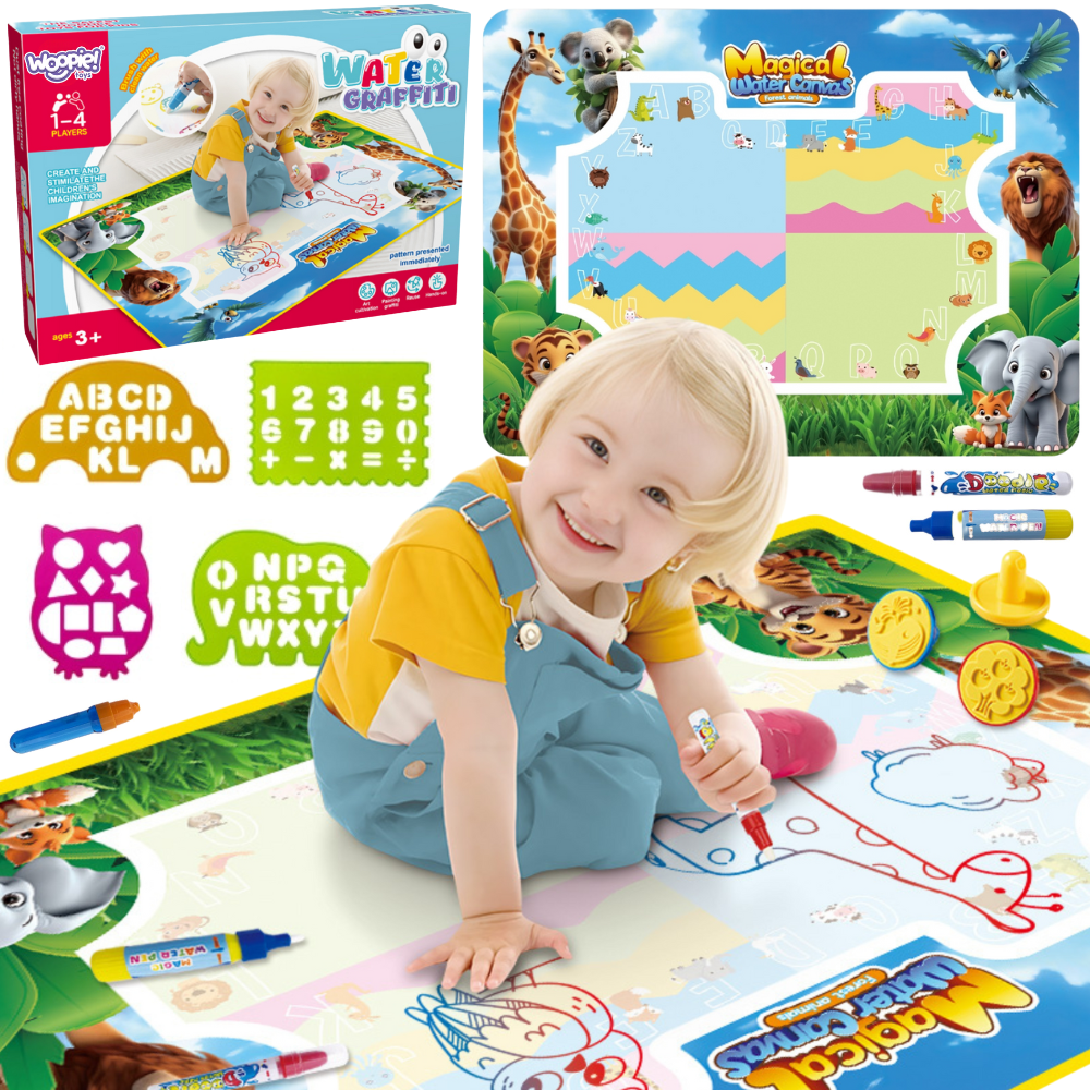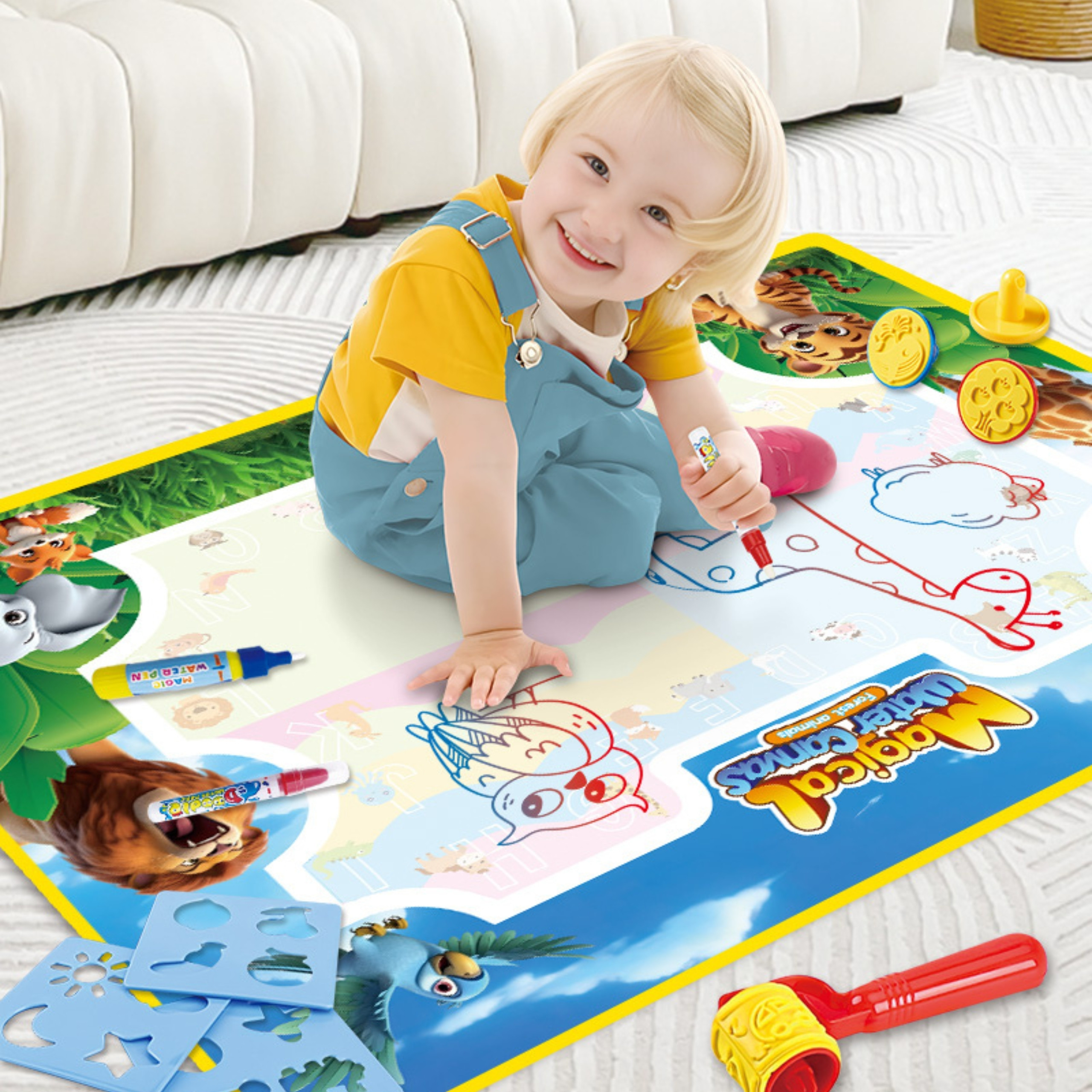 Vandens piešimo kilimėlis – kūrybinis rinkinys vaikams nuo 3 metų. Piešiama tik su vandeniu, todėl nelieka dėmių, o piešiniai išdžiūvę išnyksta ir galima kurti iš naujo.