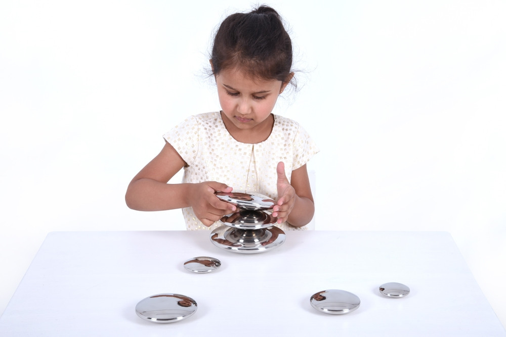 Spalvų pliūpsnio efektas suteikia kiekvienam akmenukui ryškių metalo atspalvių spektrą ir atspindį, kuris iškraipomas tarsi lęšis, kad vaikai galėtų pamatyti save ir aplinką.
