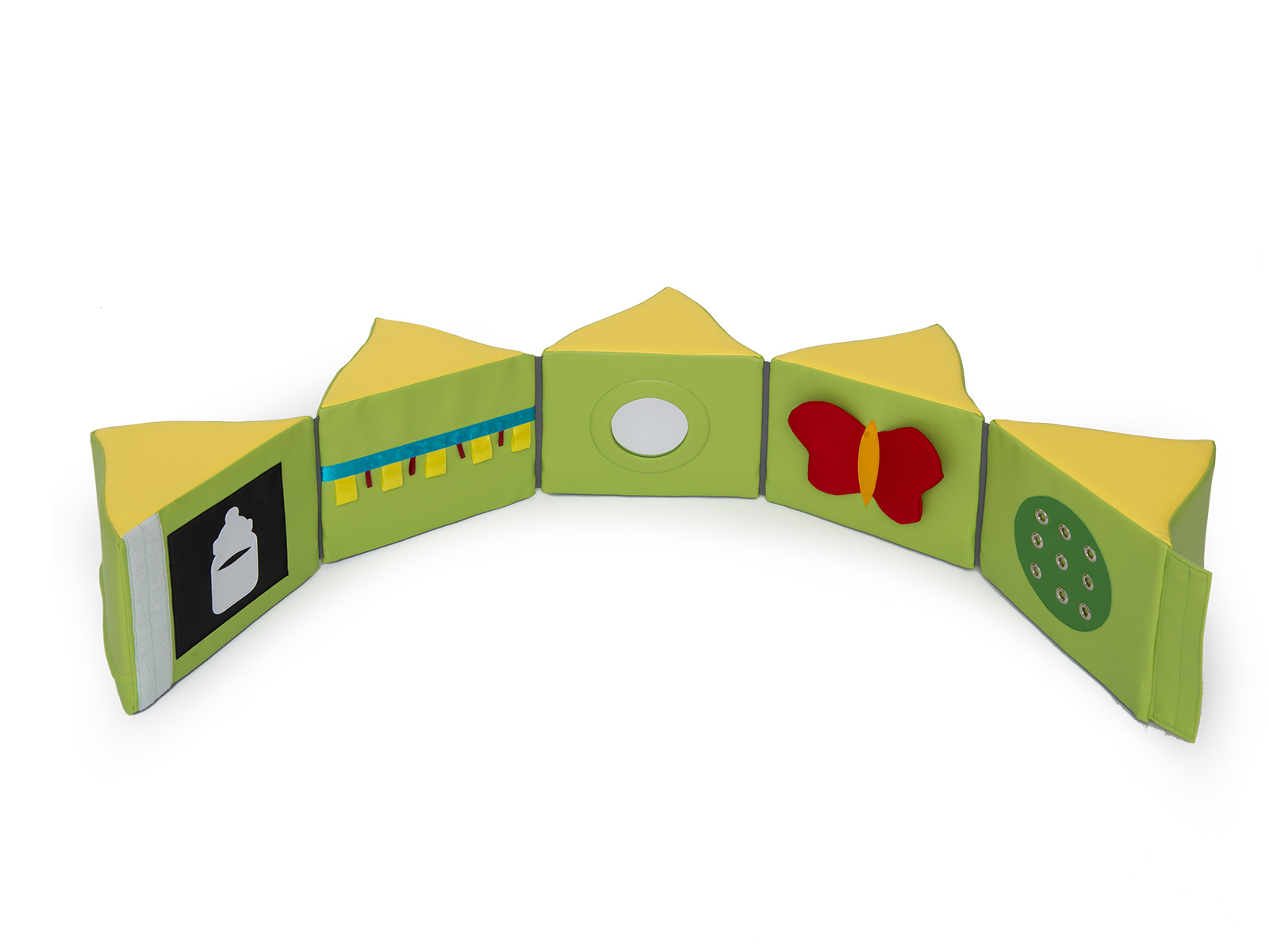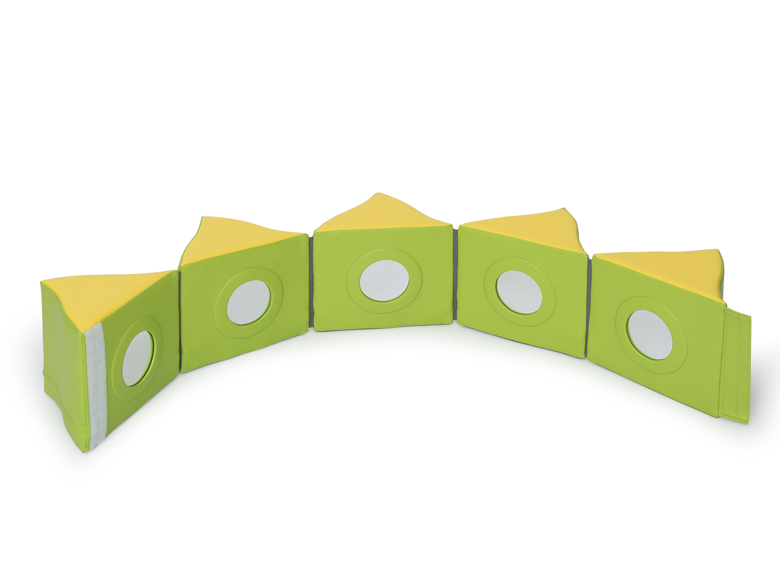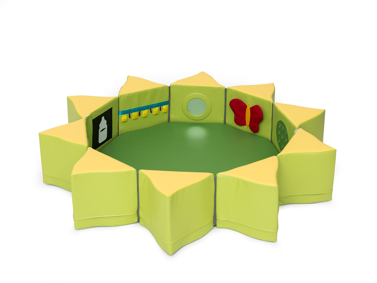 Putplasčio elementų rinkinys su aplikacijomis ir veidrodėliais, kurie sudėjus sudaro maniežą. Rinkinį sudaro: elementas su aplikacijomis, elementas su veidrodėliais ir sulankstomas čiužinys.