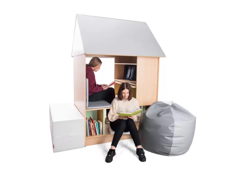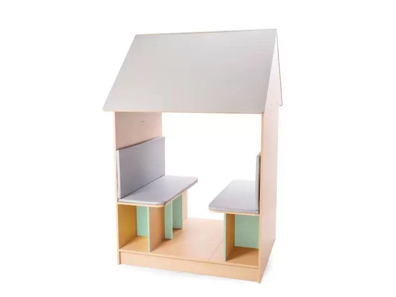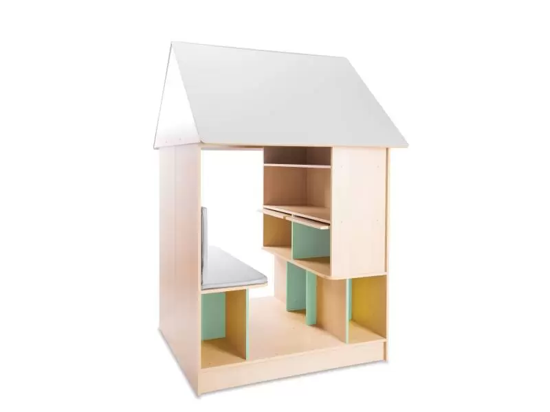 Maxi slėptuvė su sofa ir lentyna – funkcionalus baldas poilsiui ir daiktų laikymui. Sukuria jaukią, saugią erdvę vaikui.