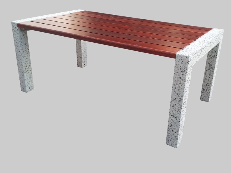 Betoninis-medinis poilsio (pikniko) stalas. Stalo pagrindas pagamintas iš natūralių užpildų. Stalviršis pagamintas iš spygliuočių medienos, impregnuotas dviem sluoksniais lazūrinio lako ir dviem sluoksniais lako.