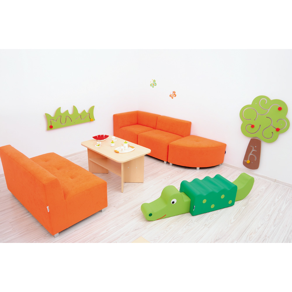Didelė sofa. Estetiškai pagaminta sėdynė, aptraukta minkštu ir maloniu liesti apmušalų audiniu, matmenys pritaikyti pagal vaikų ūgį. Medinė konstrukcija užtikrina stabilumą ir patogumą mažiesiems naudotojams. Sėdynė pastatyta ant metalinių kojelių. Idealiai tinka žaidimams, poilsiui ir bibliotekos kampeliams.